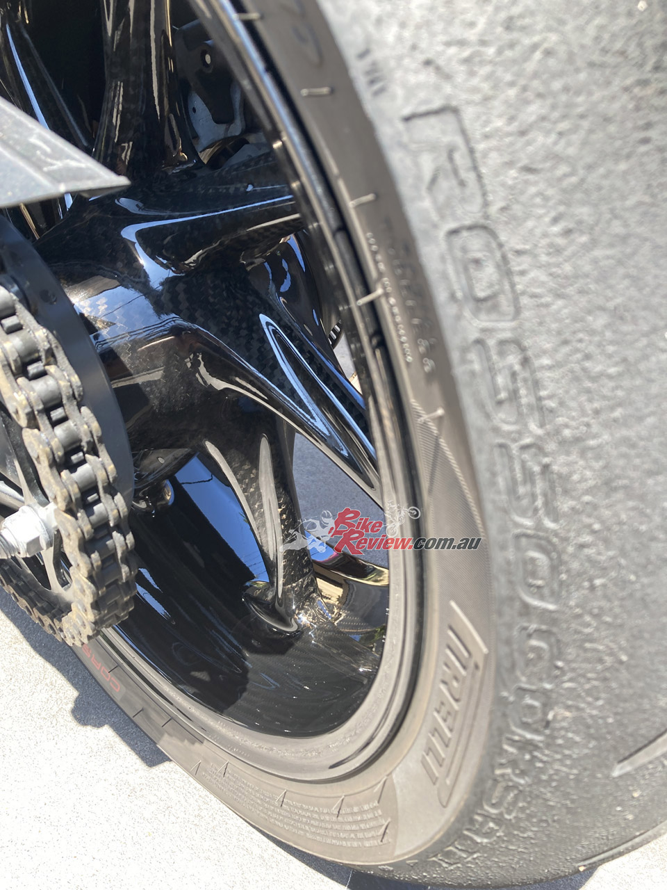 Wheels & Tyres: Carbon-fibre wheels, 3.50 x 17in, 6.00 x 17in, Pirelli Diablo Rosso Corsa II 120/70 ZR17, 190/55 ZR17.