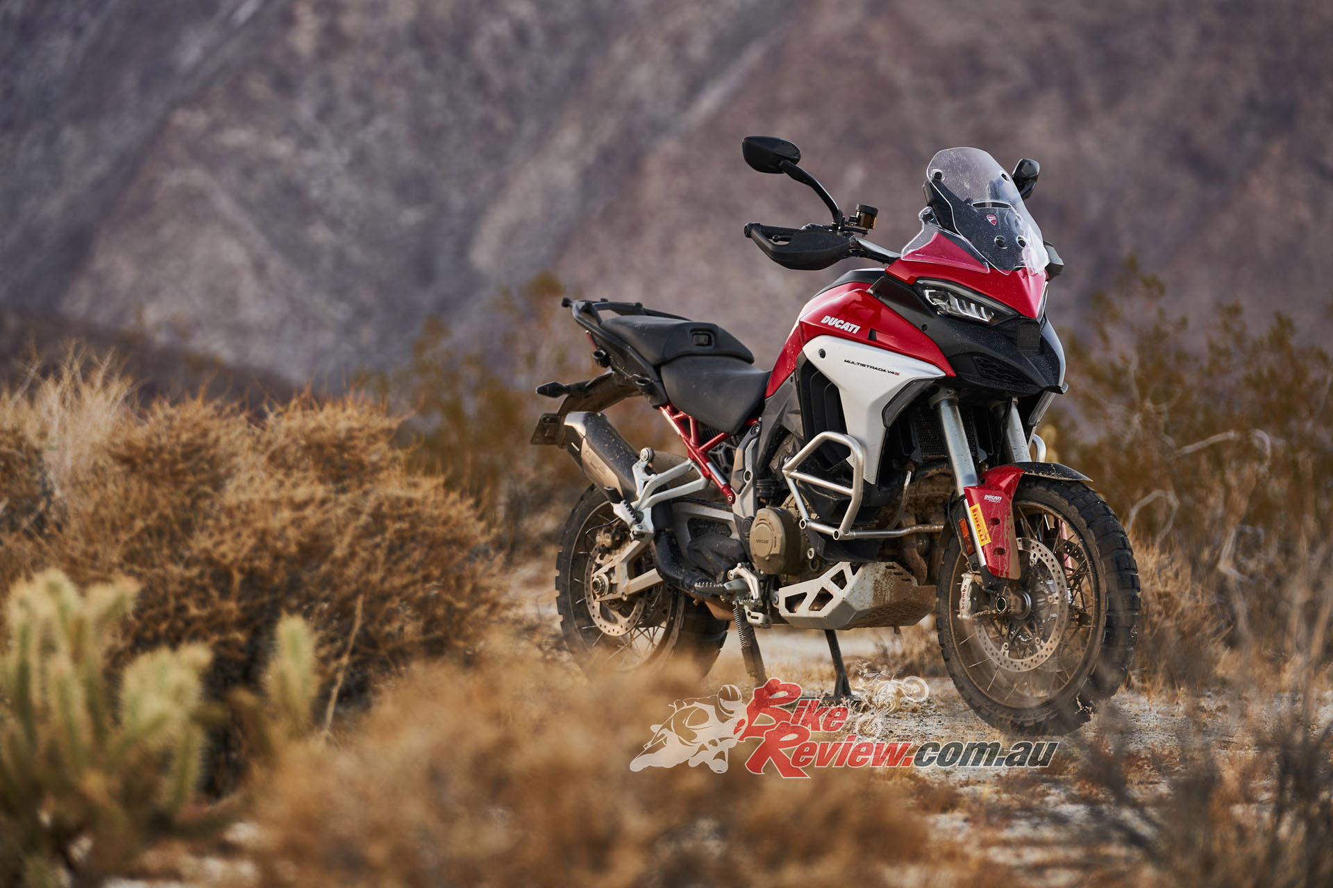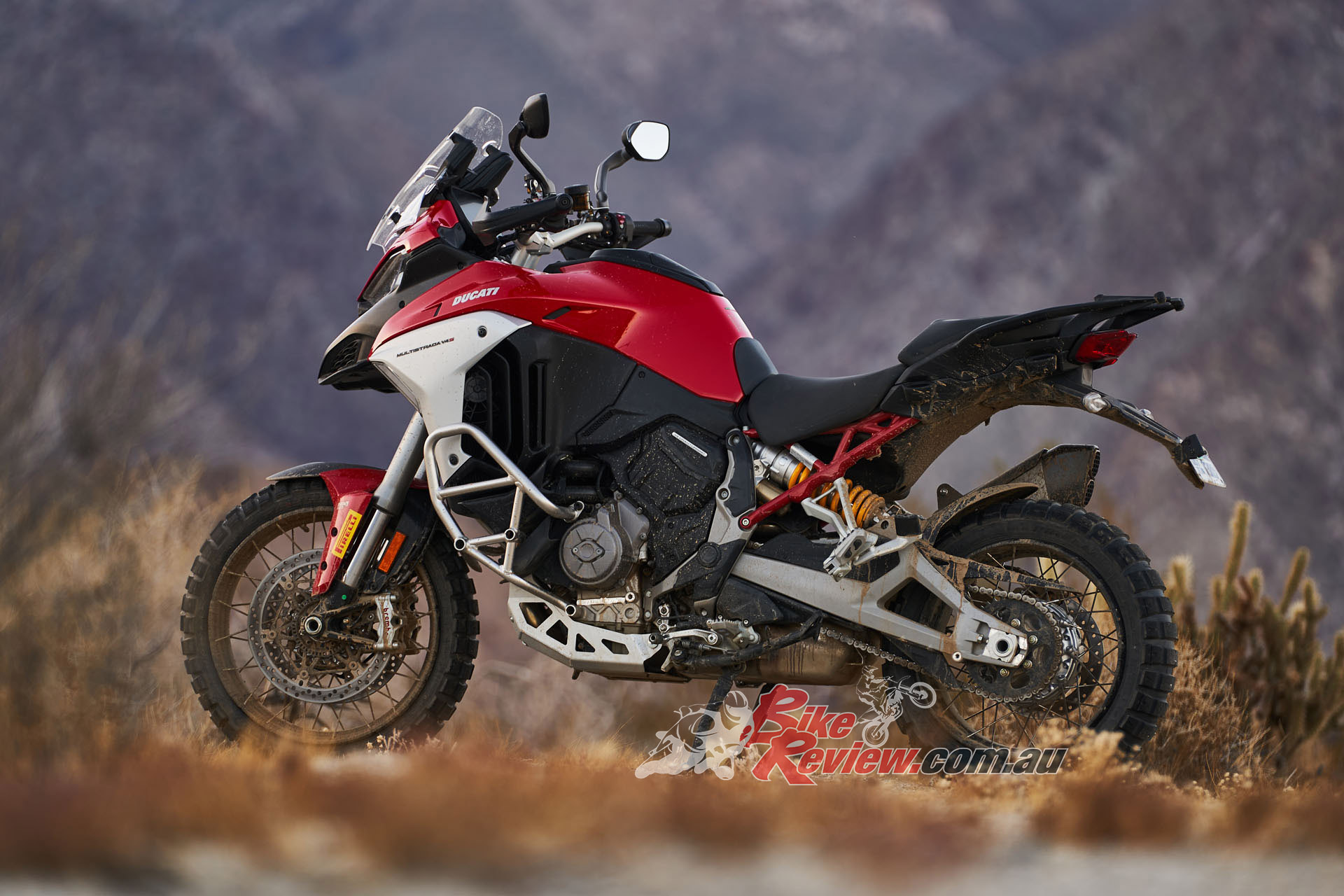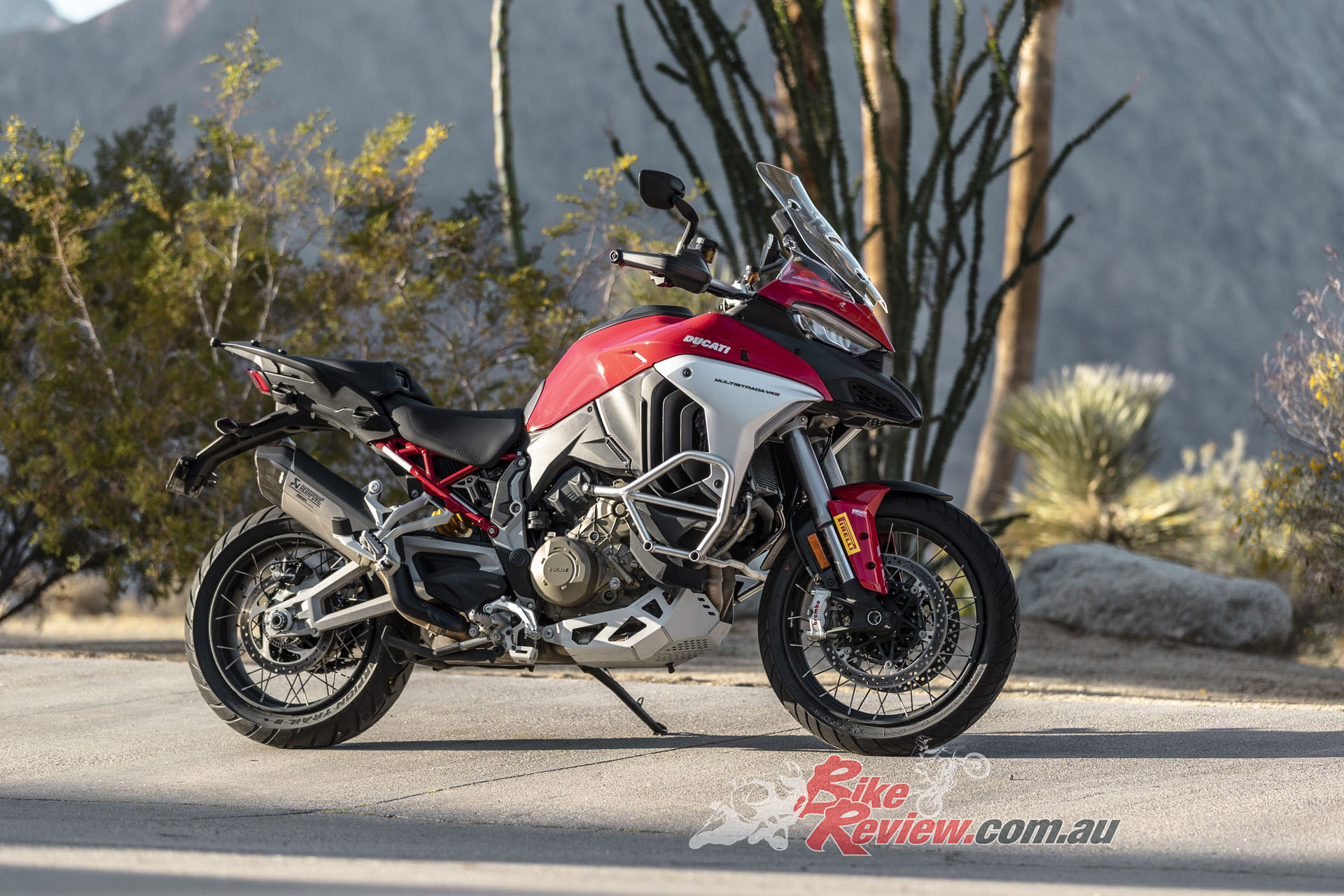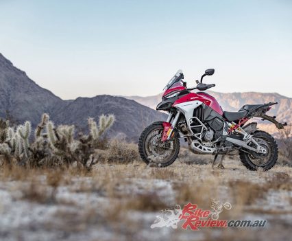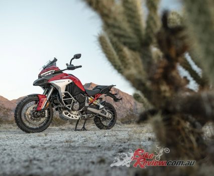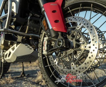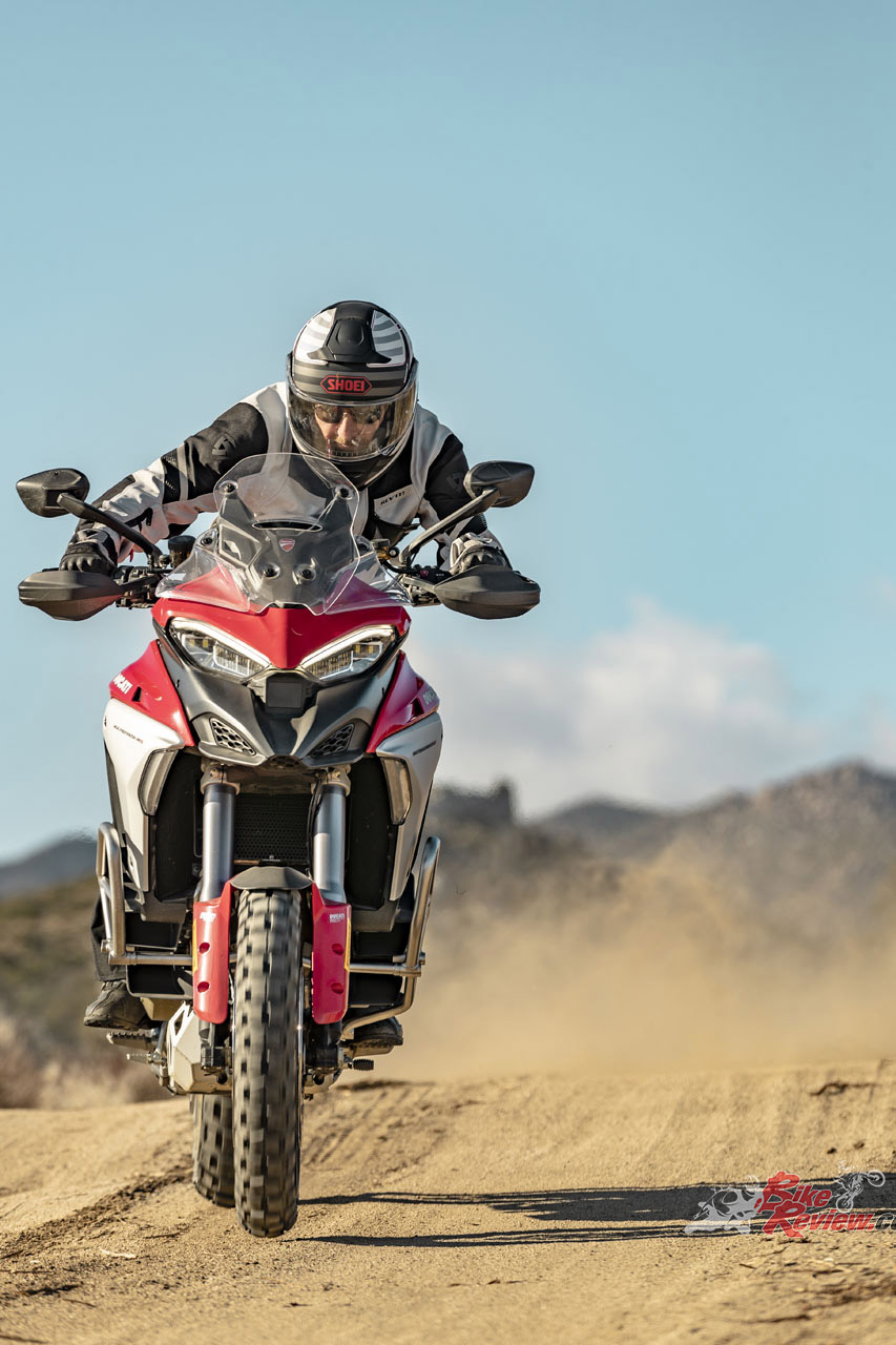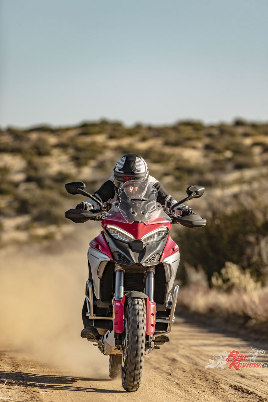 The V4 Multi is exemplary at gaining and losing speed, even off-road. The motor is remarkably tractable, pulling surely at just 20km/h in second gear to claw its way out of slippery situations. The quickshifter makes swapping gears simple and works flawlessly. Brembo Stylema brake calipers are astoundingly good, whether shedding triple-digit speeds or just a couple of km/h in the sand whoops.