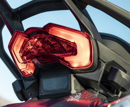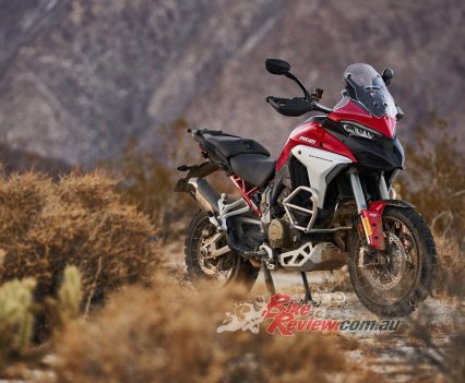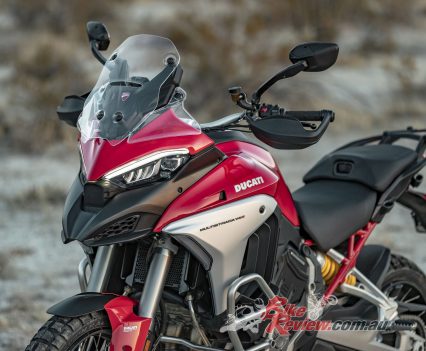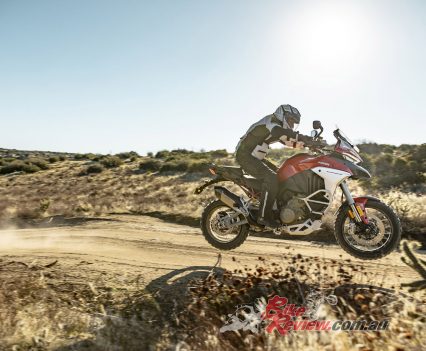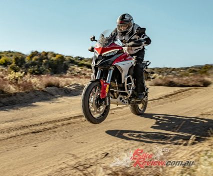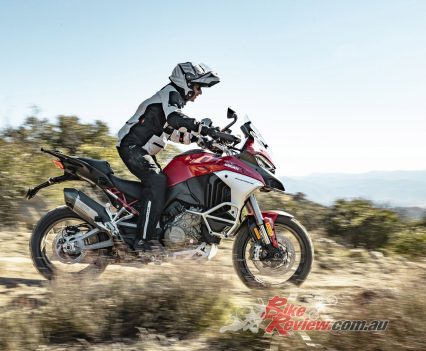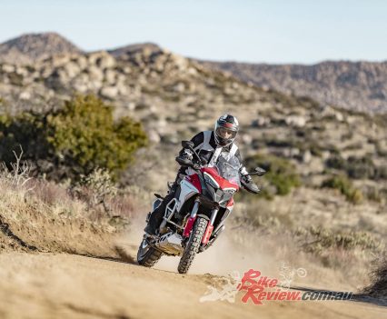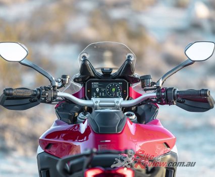 While the Mutlistrada V4 won’t be able outrun a KTM 1290 Super Adventure R in the dirt, the imposing Ducati performs markedly better off-road than its appearance might lead you to believe, especially with the knobby tyres fitted to our test bike. Ergonomic updates make it easier to move around on the bike, whether standing or shifting your weight further back, while 170mm and 180mm of front/rear suspension travel absorbs reasonably big hits.