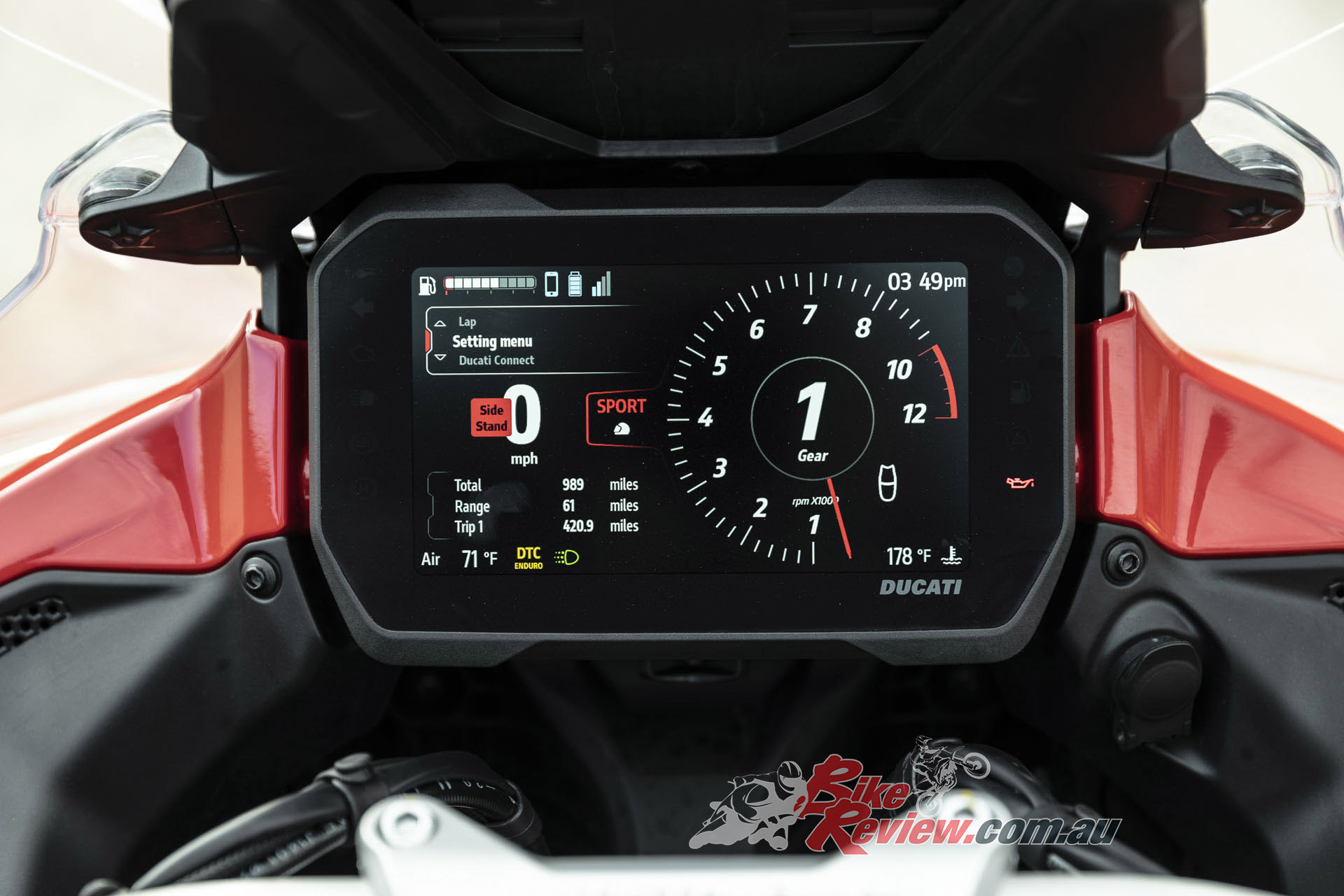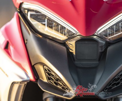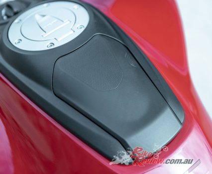 Navigating the multitude of apps is less intuitive, as you’ll need to sort through the Ducati Connect app that “mirrors” your phone, the Sygic navigation app, Ducati Link, and the MyDucati app. A rubberised and waterproof smartphone compartment with USB charger resides behind the fuel filler cap.