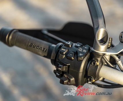 Surprisingly, the traction-control setting in Enduro mode was overly aggressive in loose dirt, so I opted to switch off TC entirely while off-road. Blessedly, Ducati allows settings for TC, wheelie control, etc., to remain stored even after keying off the ignition, preserving your chosen selections. Bikes from some other manufacturers frustratingly revert back to factory settings.