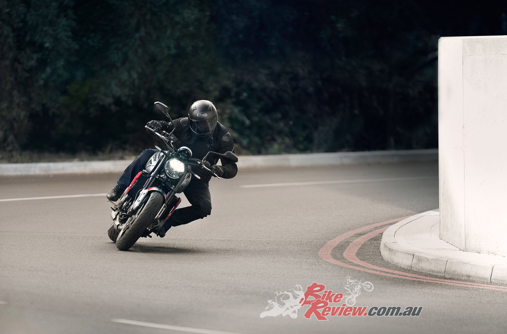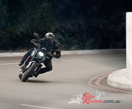 With weight carried quite high and a lazy, stable rake angle of 24.6º plus a large amount of trail at 107.3mm, the Trident feels longer than its 1401mm wheelbase. Initial turn-in is really quick, then the bike resists leaning a little before rapidly falling on its side once it passes a certain lean angle. What this means is you have to be committed to the corner and have a lot of trust in the grip if you are having a go, as once in a turn the Trident likes to stay on the one line. For medium paced riding where you are not using full lean, the geometry makes more sense, and will suit new riders more than experienced riders.