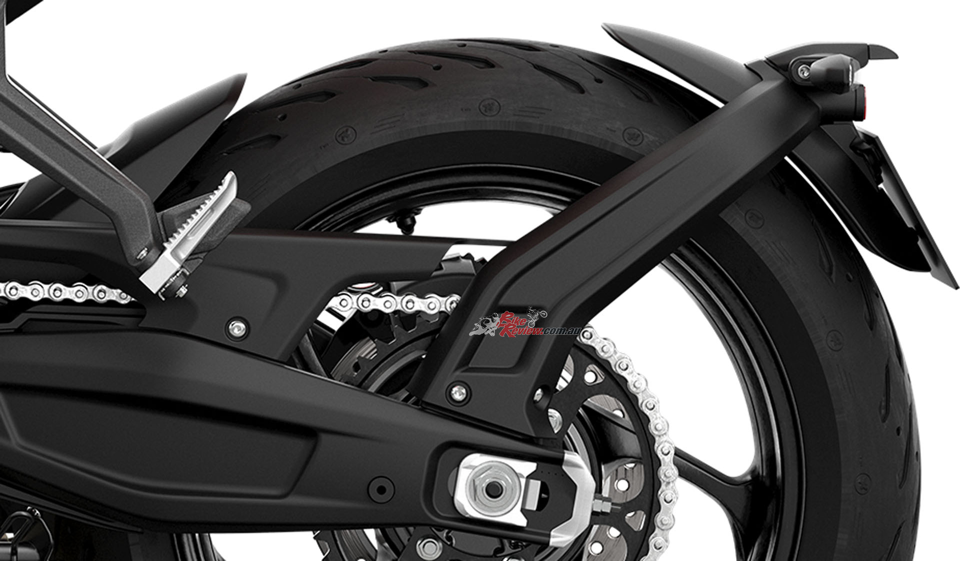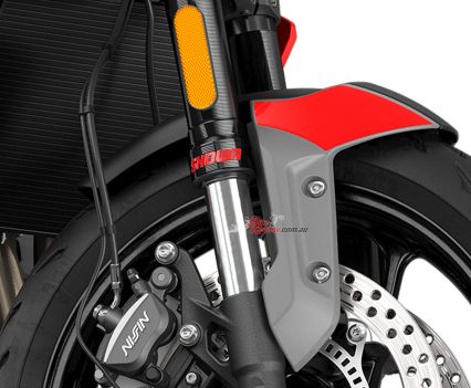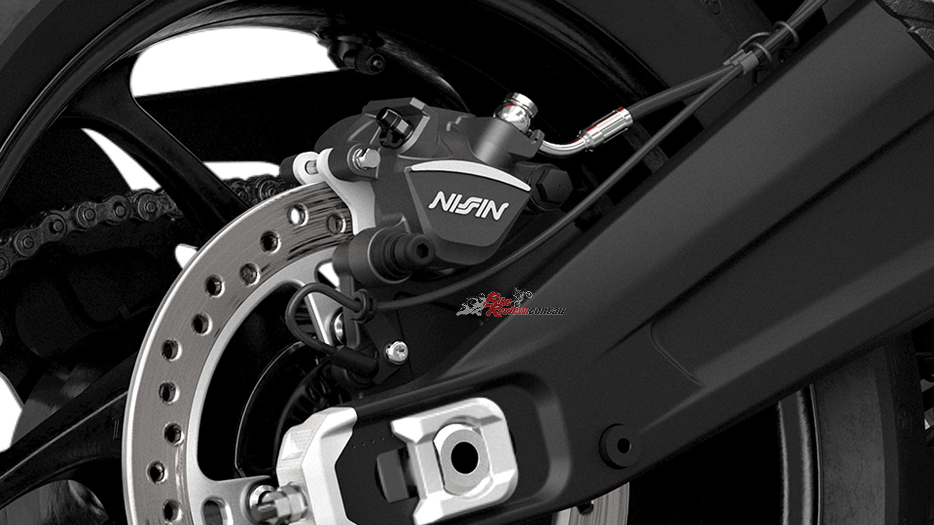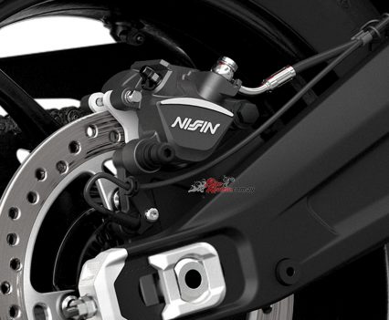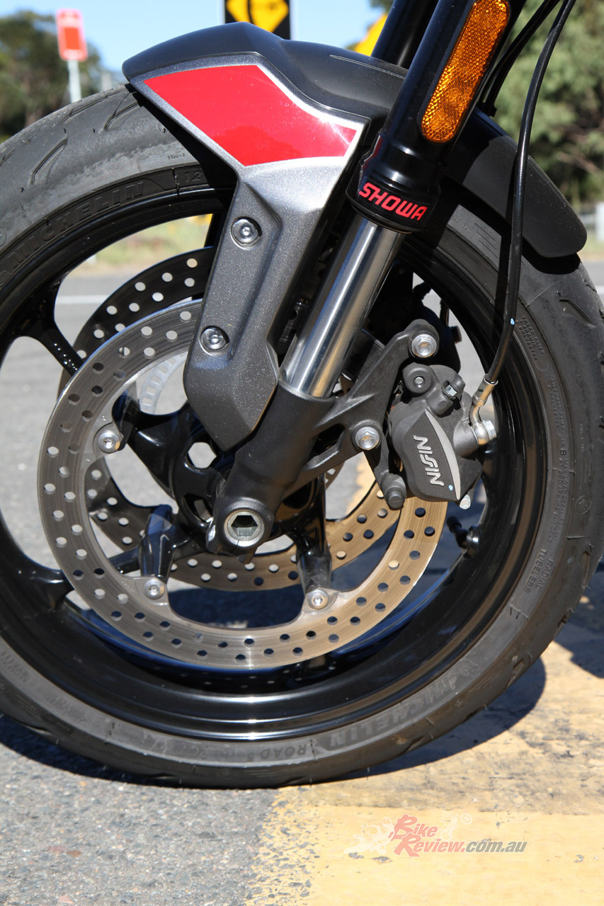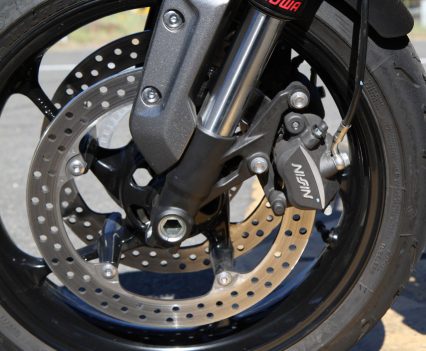 Brakes: Nissin two-piston sliding calipers, twin 310mm discs, ABS (f) Nissin single-piston sliding caliper, single 255mm disc, ABS (r).