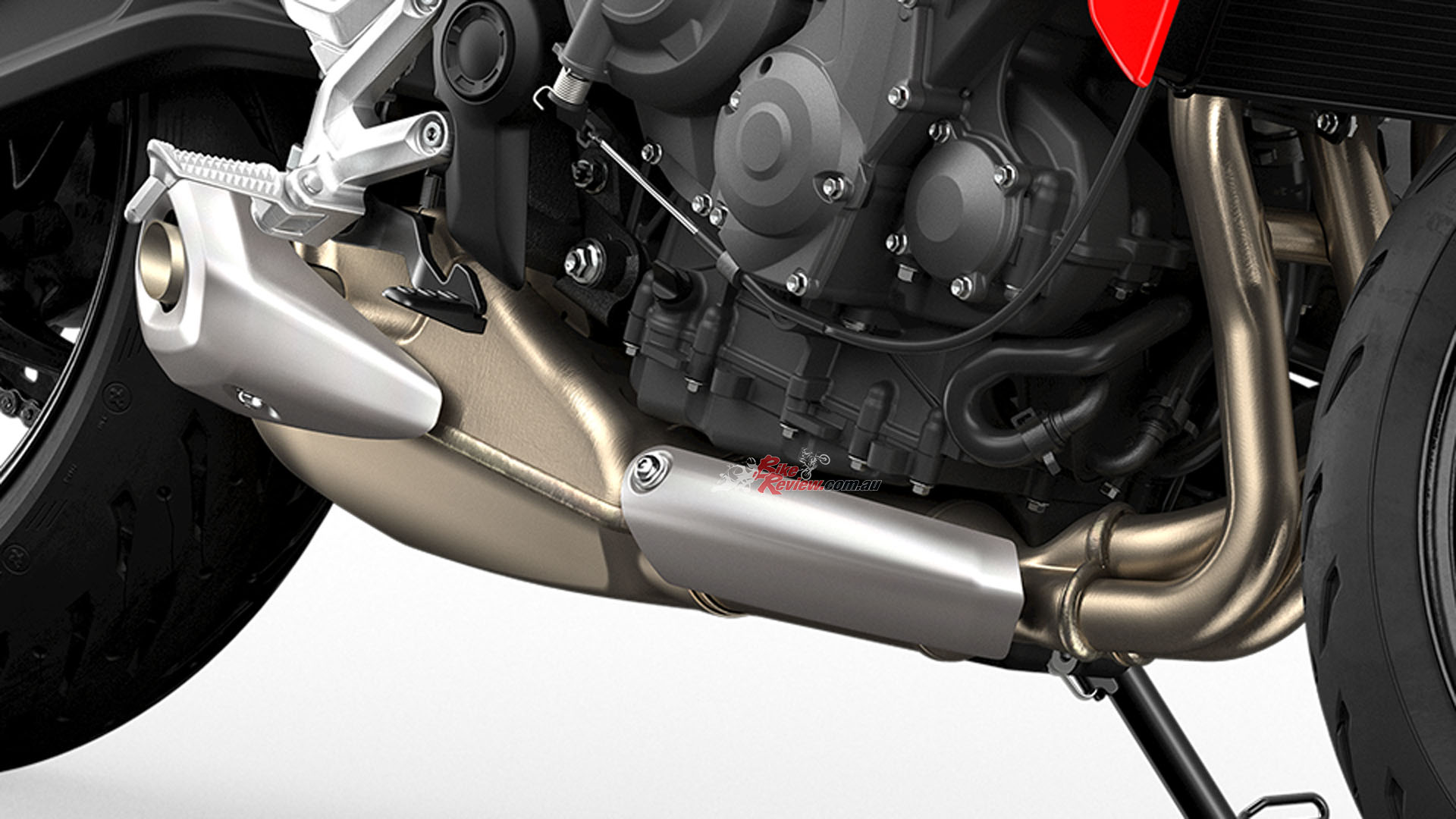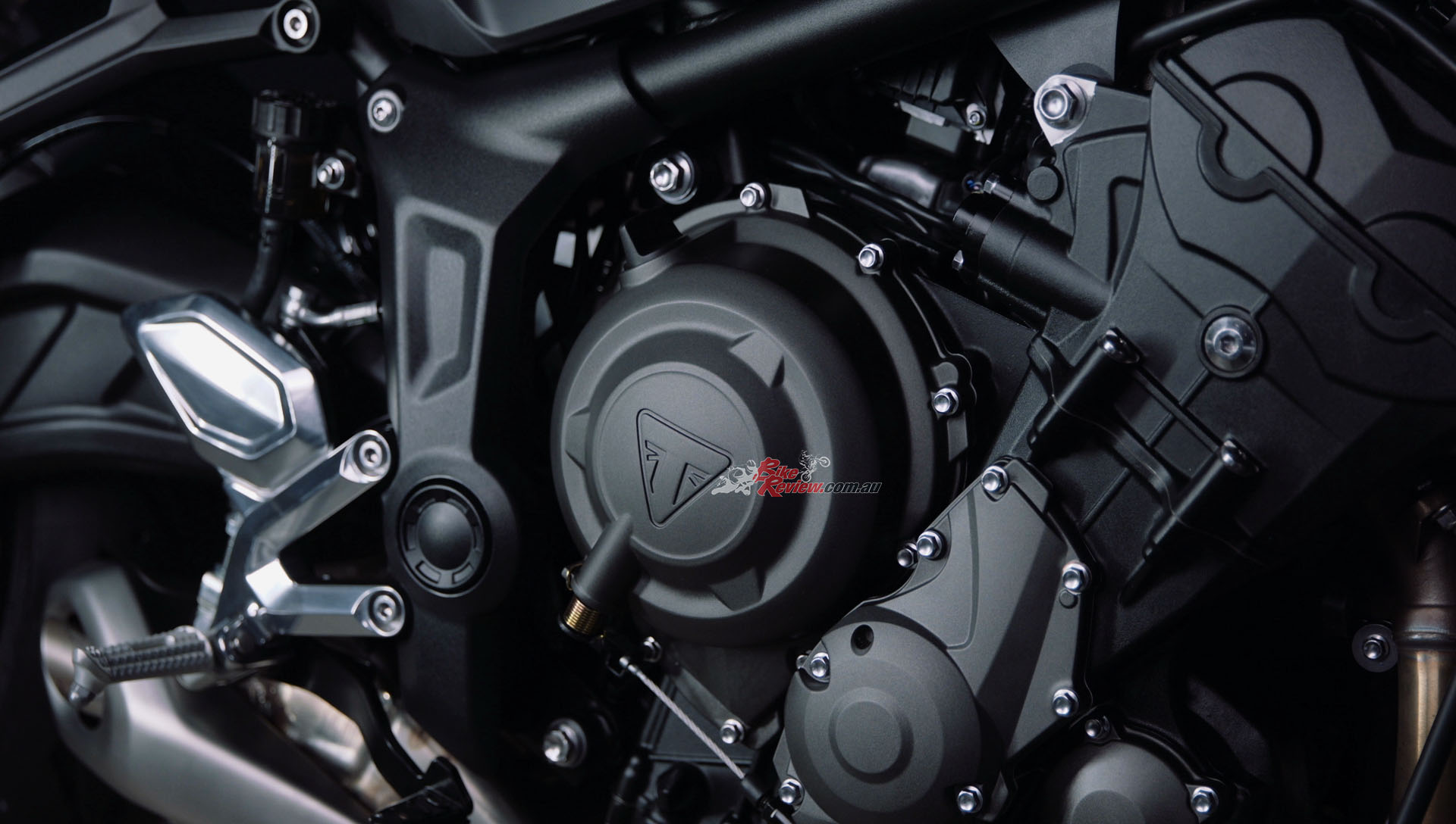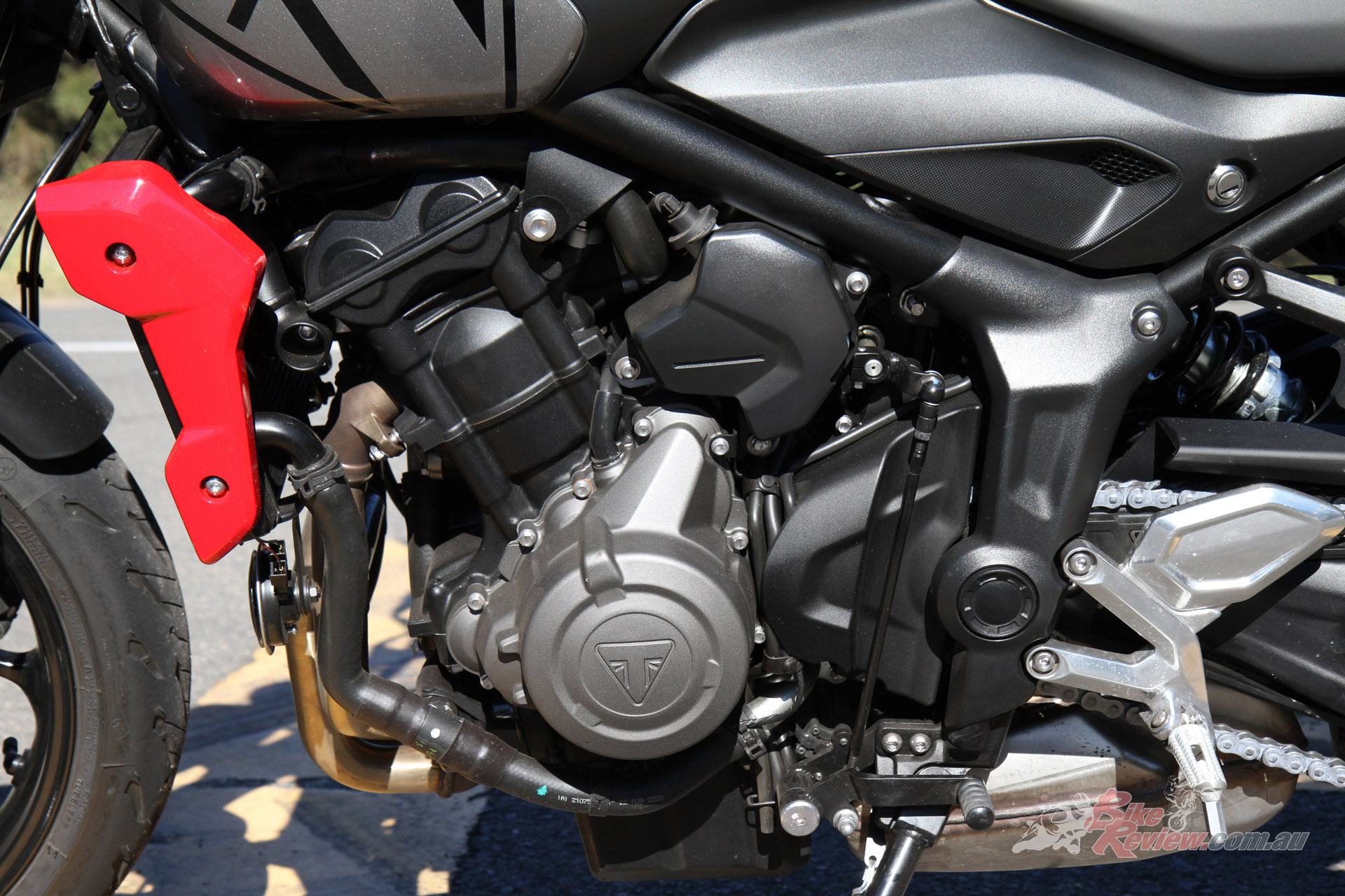 Liquid-cooled, 12 valve, DOHC, inline three-cylinder four-stroke, 660cc, bore x stroke 74mm x 51.1mm, compression ratio 11.95:1, EFI Multipoint sequential electronic fuel injection with electronic throttle control, Stainless steel 3 into 1 header system with low single sided stainless steel silencer, wet, multi-plate clutch, six-speed gearbox.