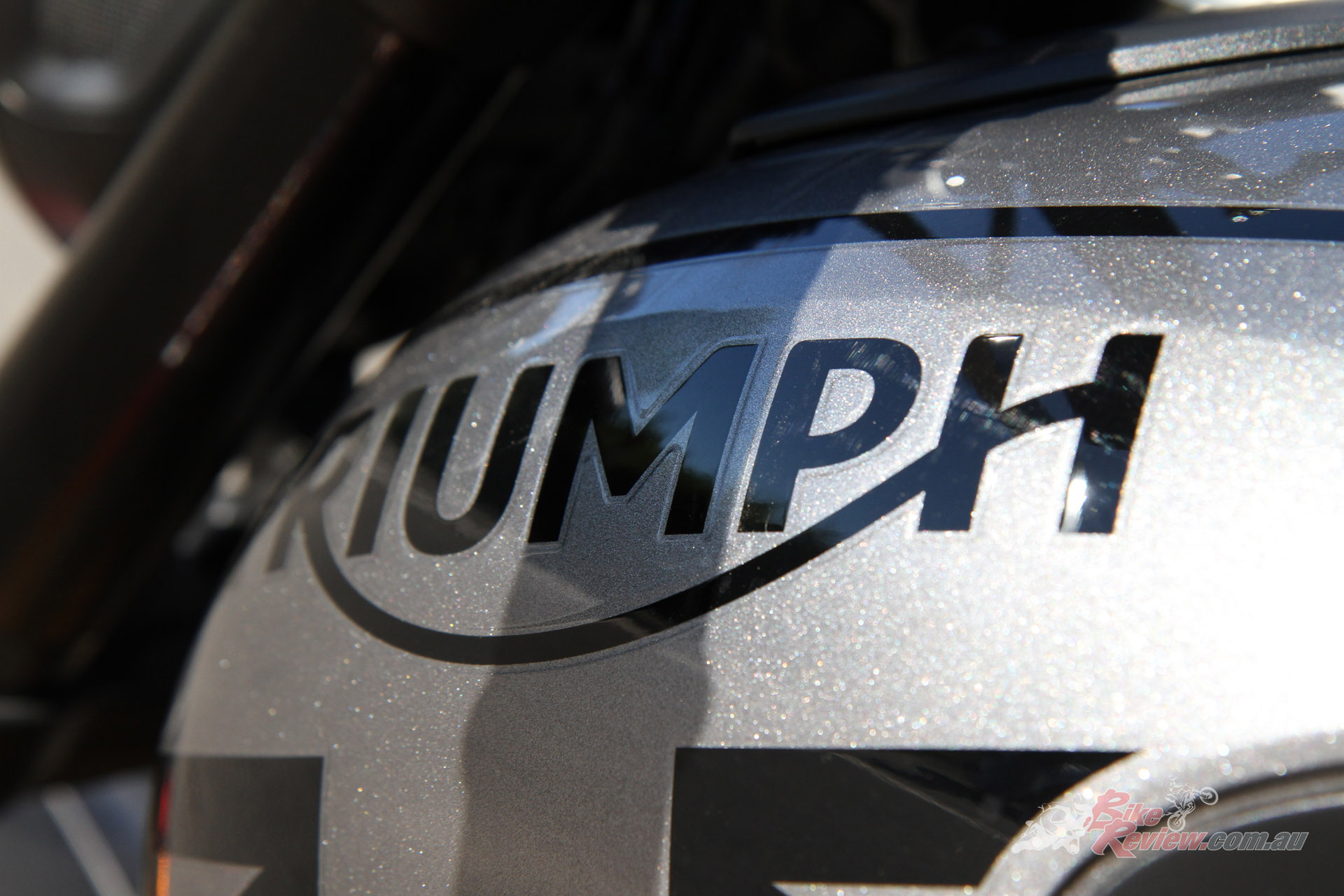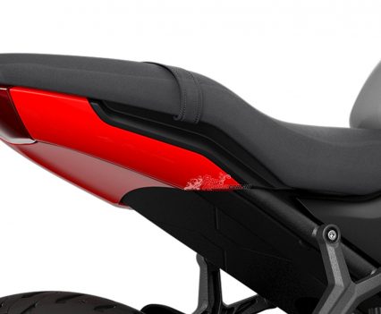 The Trident is available in four colour schemes: Silver Ice & Diablo Red, Matt Jet Black & Silver Ice, Crystal White and Sapphire Black. Triumph logos can be found sprinkled across the whole bike, a nice touch to add a premium feel to their bike. In addition, on the side of the tank, an aluminium Trident badge with diamond machined detailing finishes off the bike nicely.