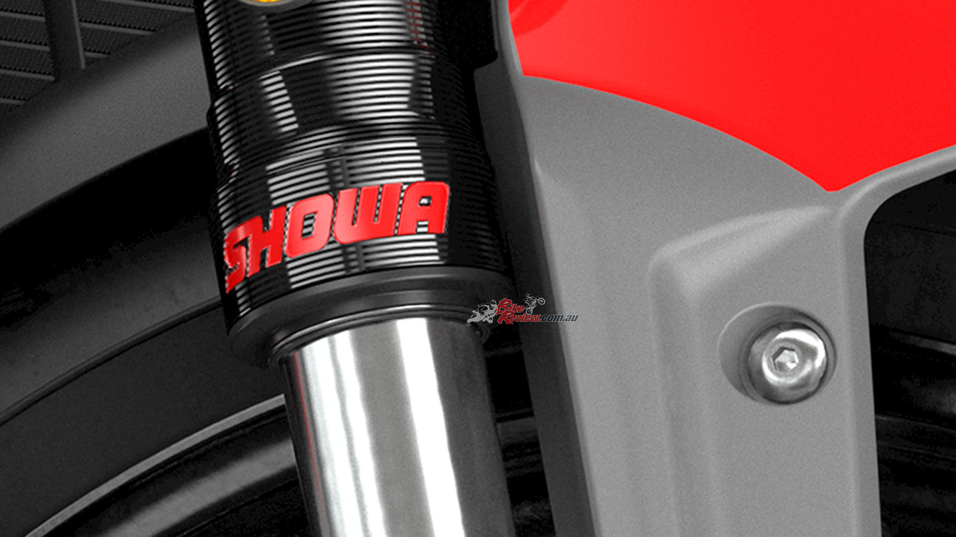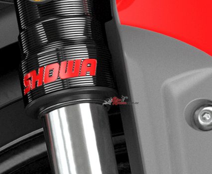 Suspension: Showa 41mm upside down separate function forks (SFF) (f), 120mm travel, Showa monoshock RSU, 133.5mm travel, with preload adjustment (r).
