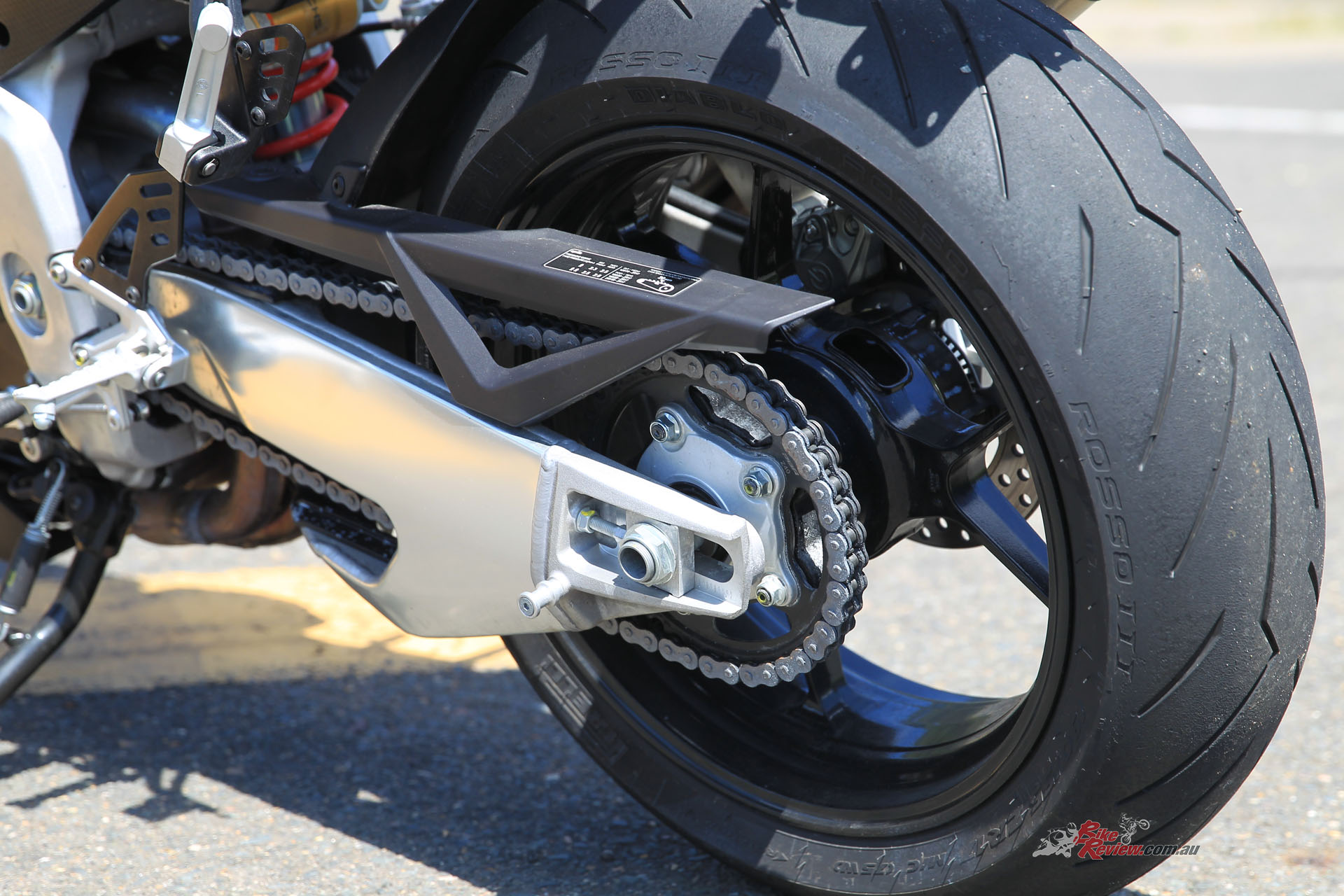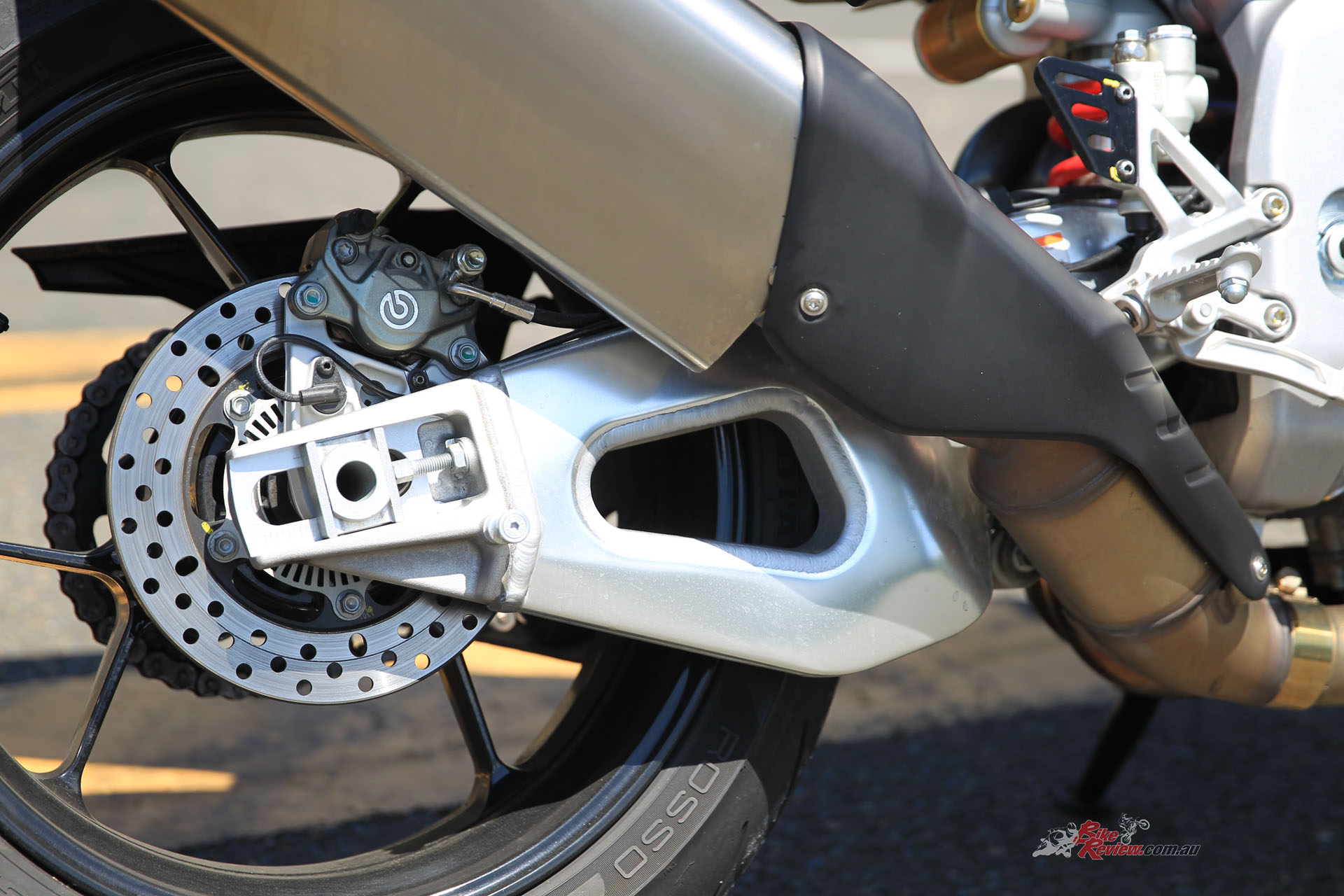 One area that isn’t more ‘Touring’ or nakedbike easy are the brakes – they are still the same amazing units straight from the stunning RSV-4, the Brembo M50 calipers (drool) and massive 330mm front rotors (dinner plates), with a Brembo radial-pull master-cylinder up front and a 220mm rear rotor with a two-piston Brembo caliper controlling things out back. The front brakes are sensational, with brilliant feel and modulation, incredible power yet are great even at low speeds, while the rear is a little wooden in feel and could do with more power and less effort on the pedal.