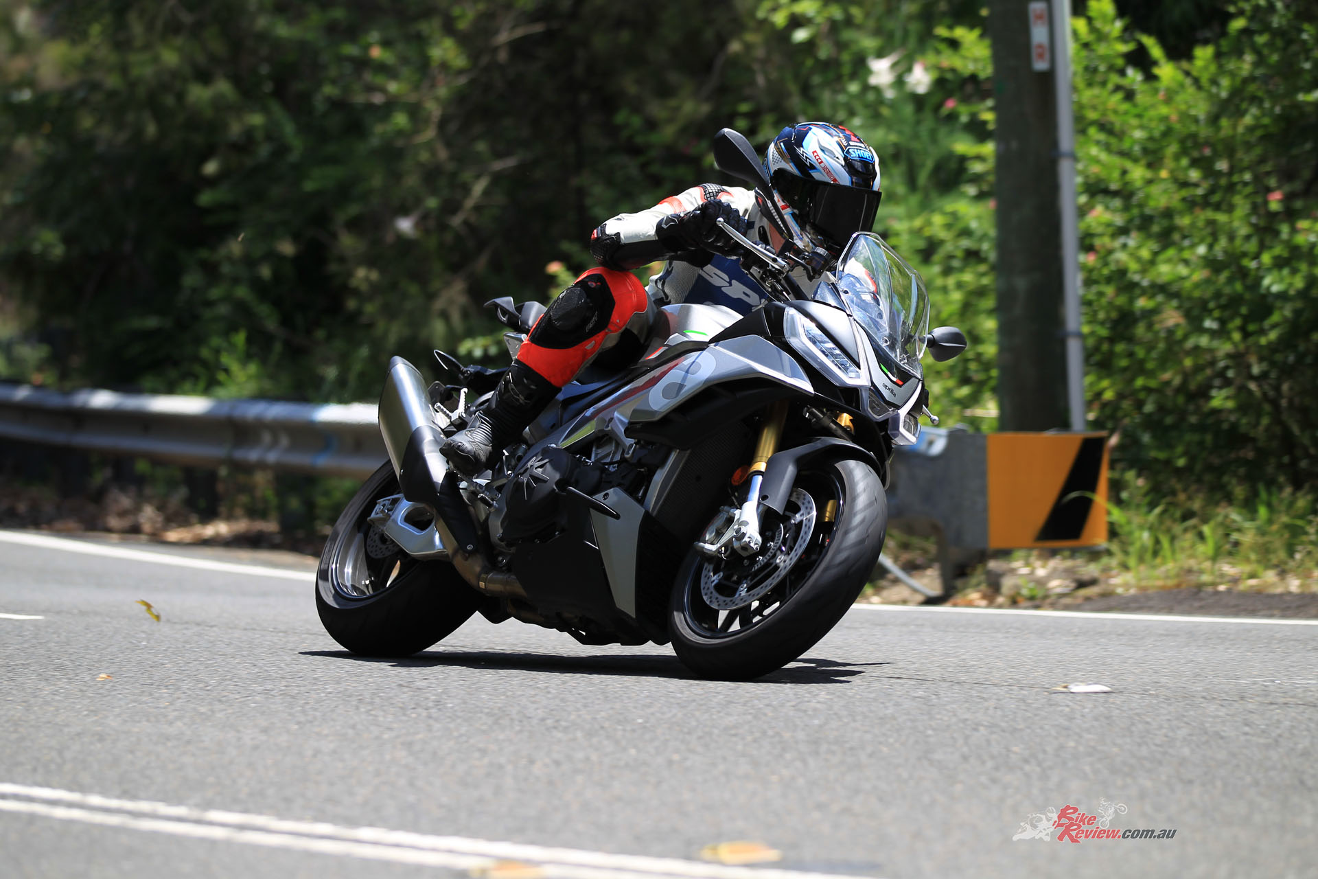 Summarising handling, it’s comfortable and soft suspension-wise, possibly too soft for some really hard riding sports riders, but the geometry of the chassis allows the bike to get aways with the soft suspension and still steer and corner well, and even remain stable on the brakes. And the brakes are huge… We are talking standard suspension settings though, and I feel with a bit of extra preload and damping, within the stock availability, the Tuono could be just about spot on for a sports naked that needs to isolate the rider from our terrible, no horrendous, roads here in Australia…