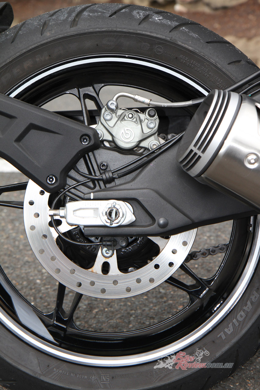 Brakes: Front: 320mm petal discs with radial-mount Brembo Stylema M4.30 four-piston calipers, Continental ABS Rear: 260mm disc with Brembo twin-piston caliper, Continental ABS