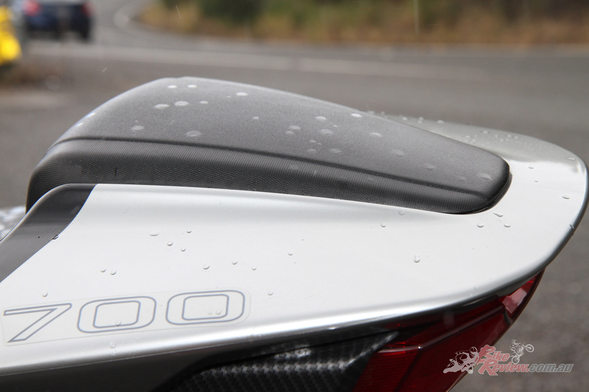 The ‘pegs are mid-ships and are definitely too low for the quality of the handling. Interestingly, the stock bike comes with a solo seat, but includes pillion pegs. Rearsets are available, as is a pillion friendly seat, from the aftermarket catalogue. A bit head scratching, really. Rearsets standard, please!