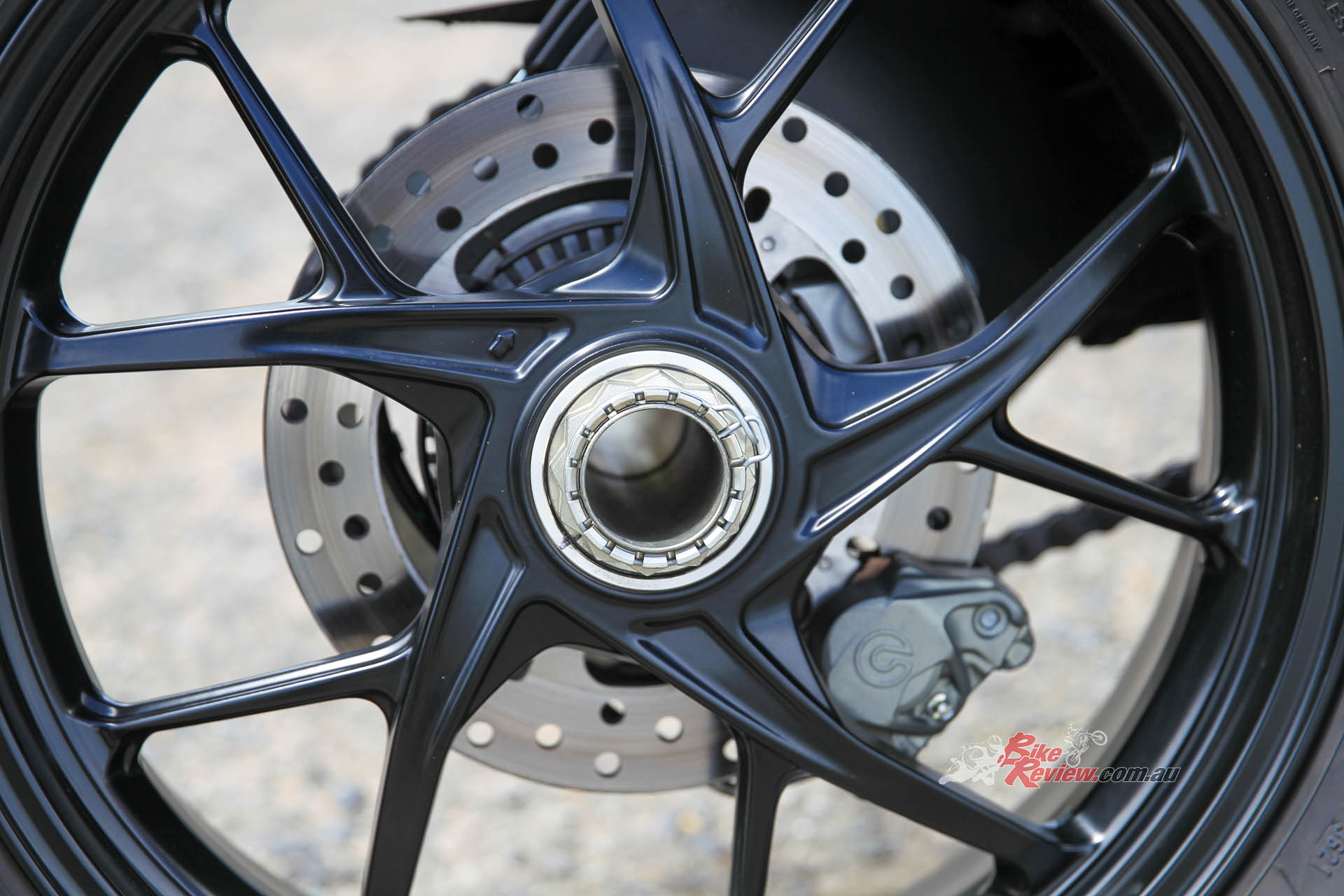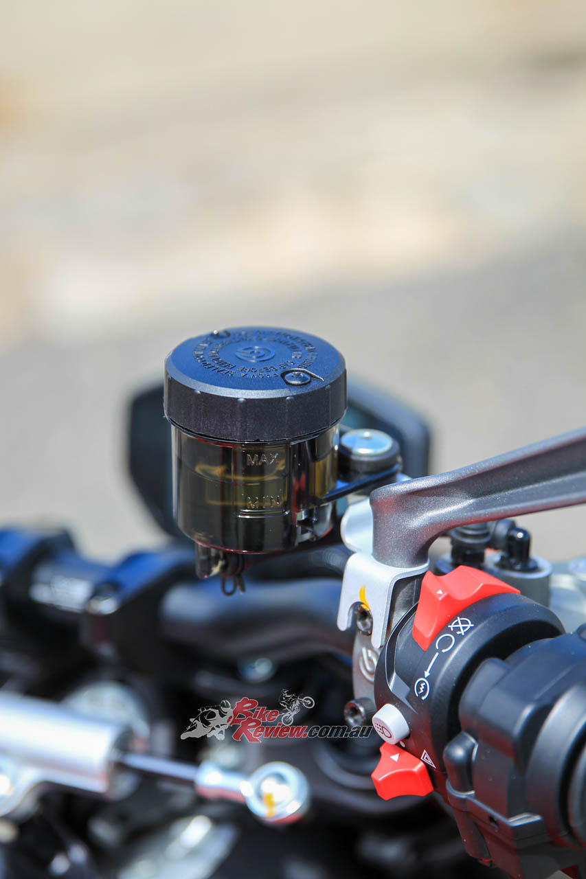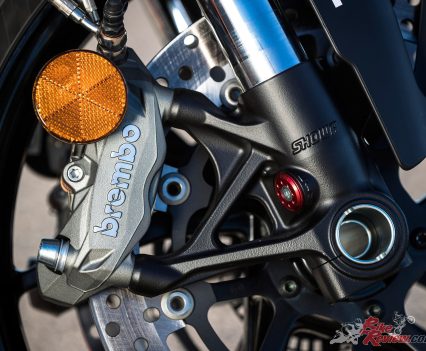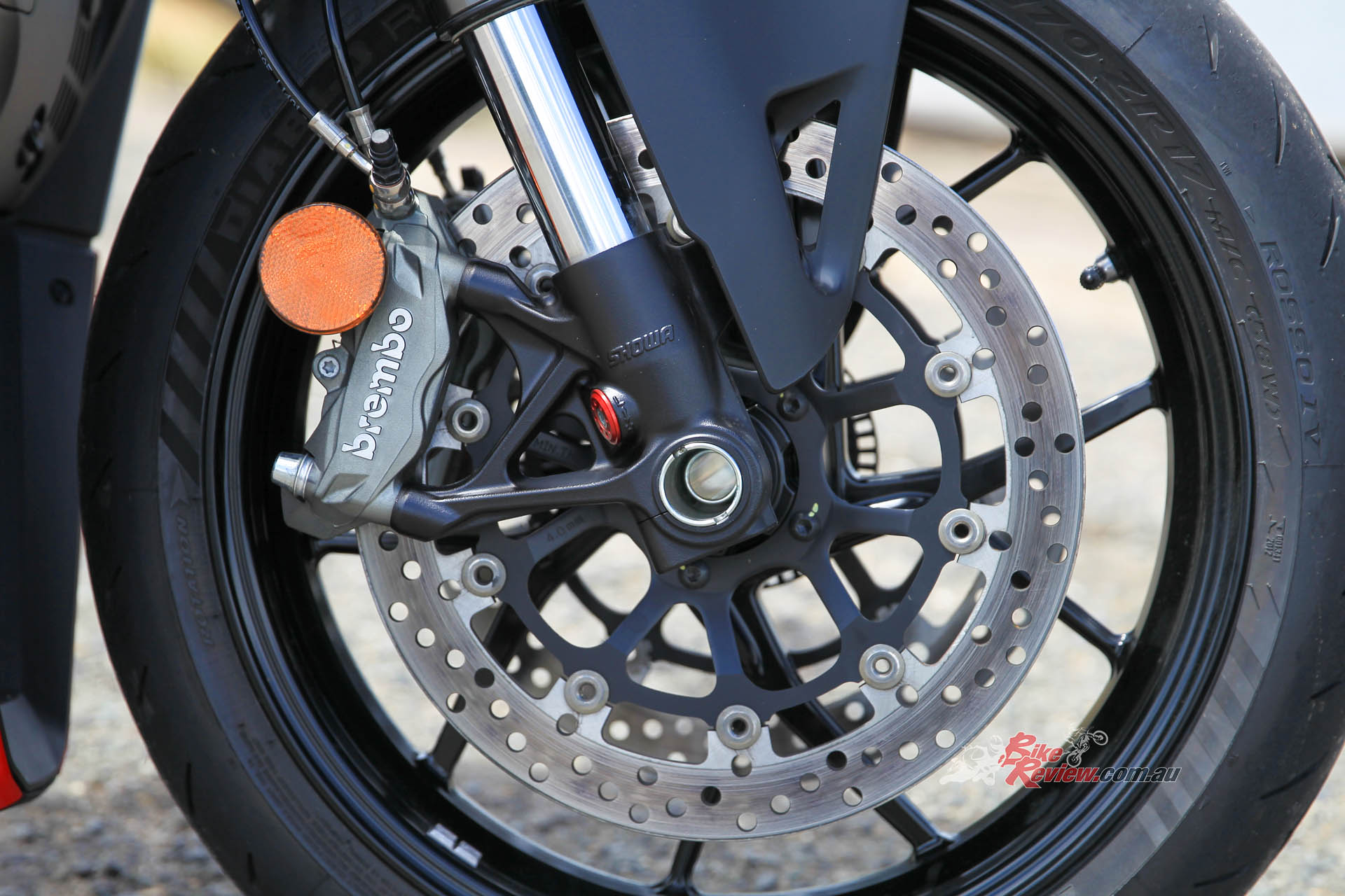 Brakes: 2 x 320mm semi-floating discs, radially mounted Brembo Monobloc M4.32 four-piston callipers with Bosch Cornering ABS EVO. Self bleeding master cylinder (f), 245mm disc, 2-piston calliper with Bosch Cornering ABS EVO (r)