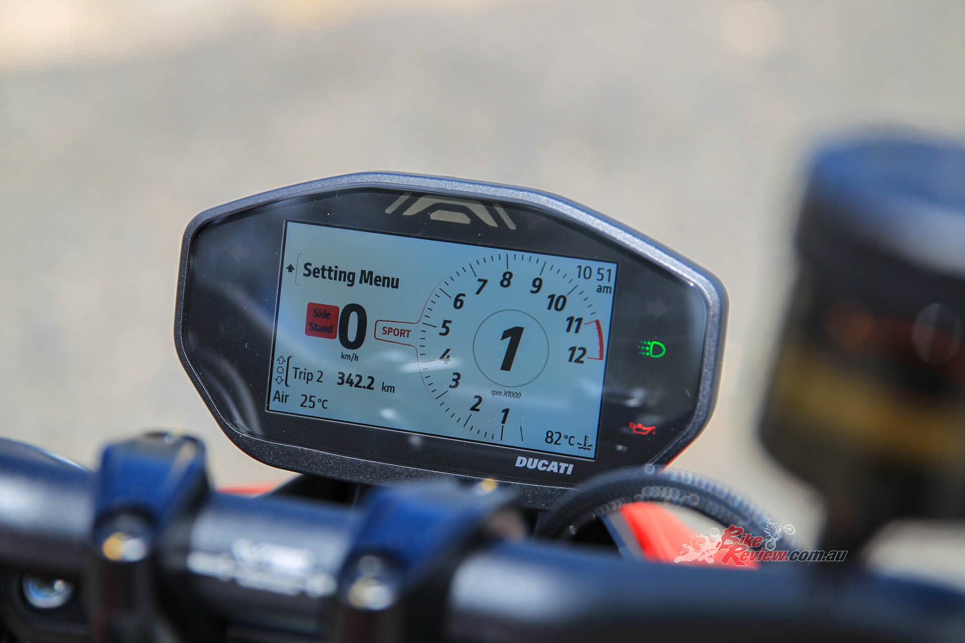 The plethora of riding assists are controlled via the full-colour TFT dash, which has been shrunken from 5in on the V4 to 4.3in. The software on the dash is quite easy to use compared to a few of Ducati’s competitors, the buttons are slightly confusing going into the menu blind, but I got the hang of it after a while. The riding modes are changeable/customisable for power modes, traction control, wheelie control, cornering ABS and engine braking.