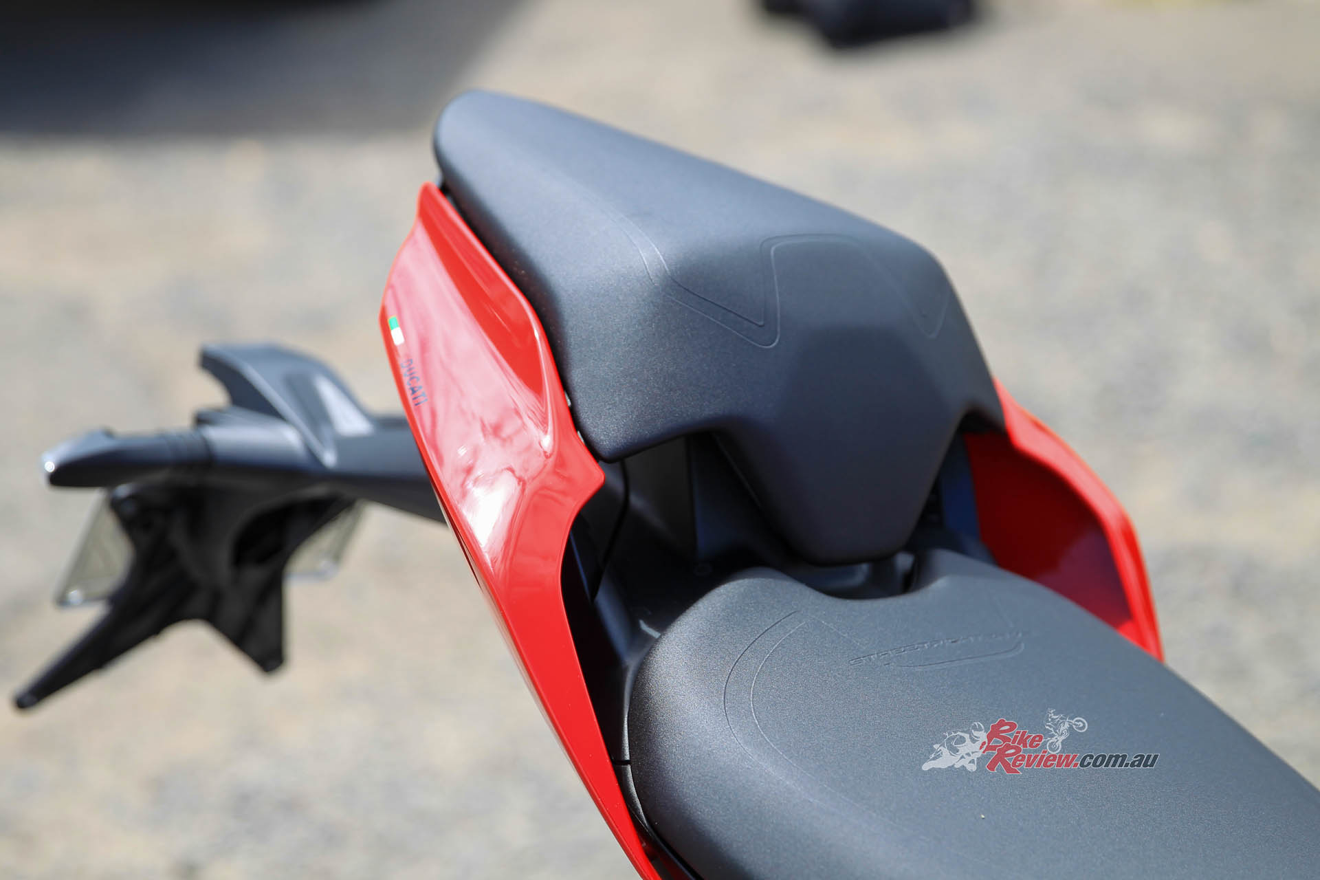 Ergonomics has major rider-centric features and is focused on road use with the added values of sportiness and comfort. The high and wide aluminium handlebars replace the handlebar risers of the Panigale V2. The saddle now is wider and has new padding that contributes to make this bike even more comfortable. In addition, the footpegs have been repositioned to increase the amount of room.