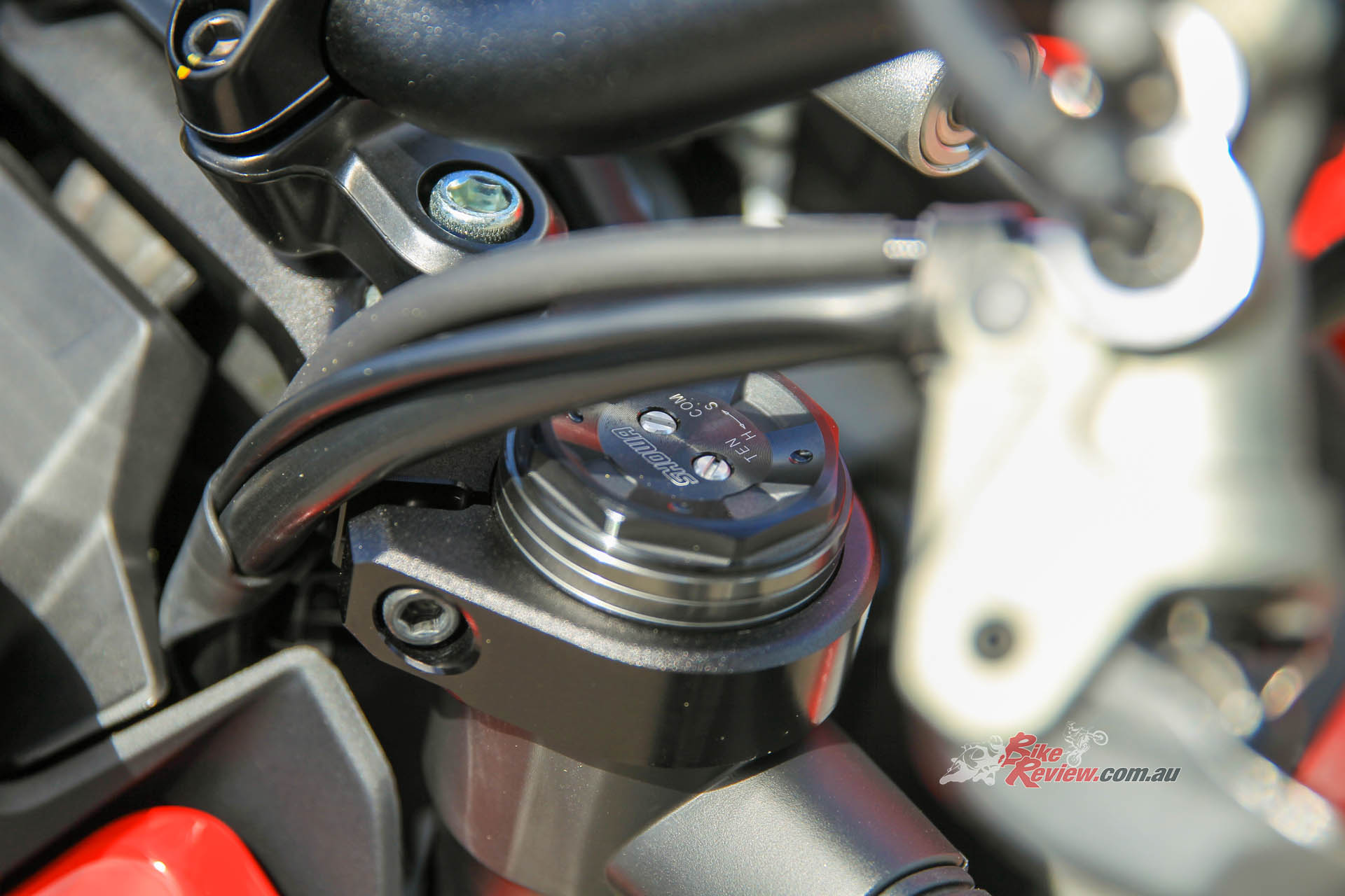 It’s awesome to see a steering damper, especially in such an easy spot to change if you’re looking to go with a more or less aggressive setup. It works really well with stabilising the bike on hard bumps and mid corner, it compensates a lot for the suspension at stock settings, keeping the front wheel pointed where you want it to go. It does make for slightly more work at slow speeds, a lot more pushing of the bars are needed to manoeuvre the steering. Considering the setup was originally designed for the Panigale, the different weight of the headlight and dash on the steering seems to have been overlooked in the design of the Streetfighter V2.