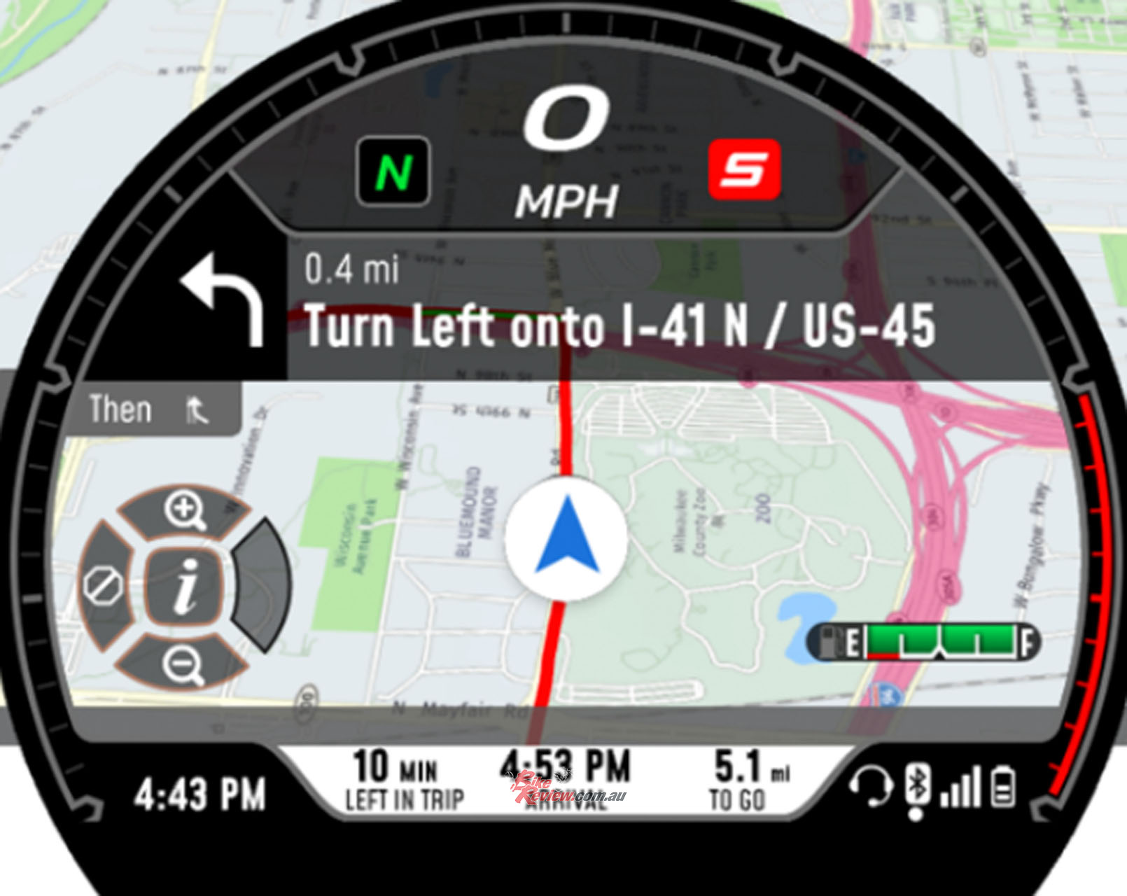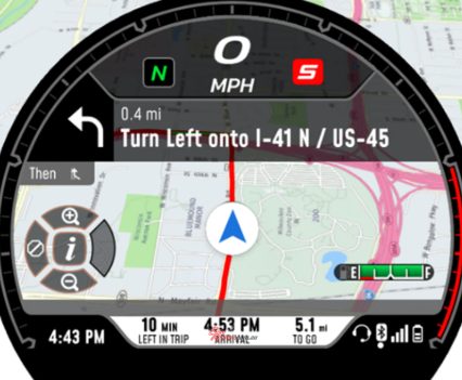 Navigation is supplied by the Harley-Davidson App for iOS or Android, which must be downloaded into the rider’s mobile device. When navigation is enabled, the rider may select a moving map display or turn-by-turn map, either of which are displayed on the screen, assisted by audio instructions through the headset.