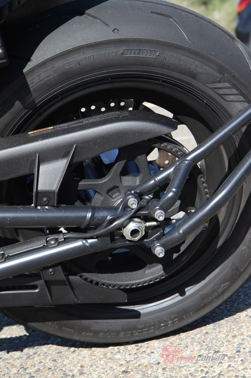 Steering is impressive in general riding – it’s light, flickable and accurate, considering there is a whopping fat front tyre doing its best to fight the laws of physics. When the going gets busy, you feel the width of the Dunlop(s) but it’s no issue and there is decent grip there but not a huge amount of feel. rear traction when hard charging is impressive, the TC doing a little bit of overtime when the going gets high but that’s at the pointy end. In general use and most conditions, it’s a very tractable bike.