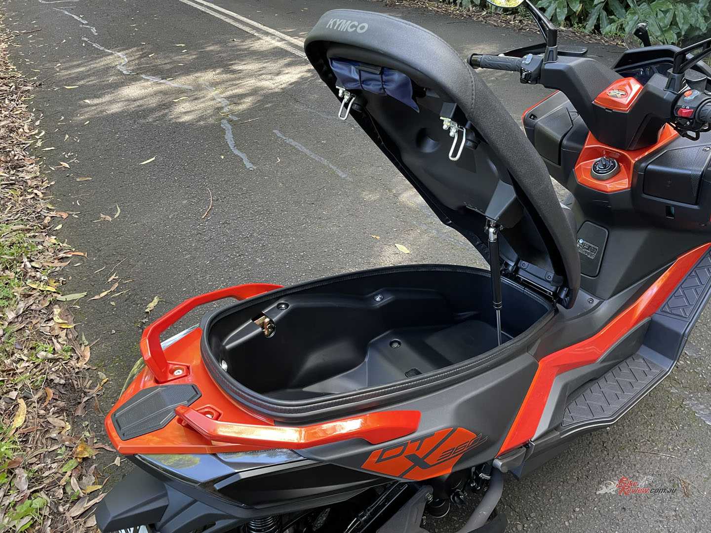 Not too sure what was wrong with just putting a key in and turning it, but onwards to the future I suppose. Unlike the Yamaha “Max” range I rode, which also uses a keyless system, I was informed that you can’t put the keys to the DT X360 under the seat otherwise it’ll lock them in there. There is a non lockable storage spot under the handlebars but I didn’t trust that I wouldn’t walk away from the scooter with the key still there. I was also far too scared to possibly immobilise the bike by testing if it would lock the keys under the seat.