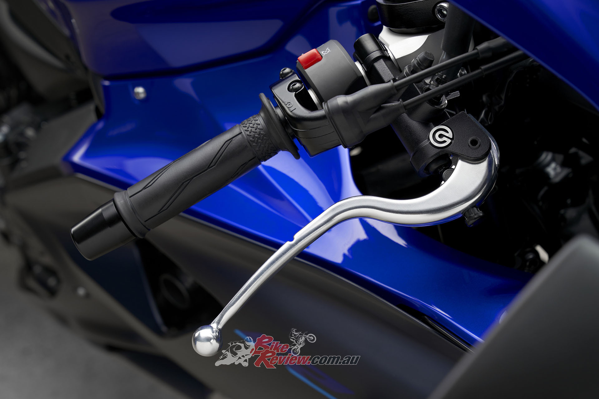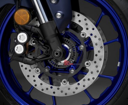 The 2022 YZF-R7 is the first Yamaha model to feature a radial brake master-cylinder from Brembo. This new Brembo radial master-cylinder provides a more linear supply of hydraulic pressure to the radial mounted, four pot front brake calipers creating excellent controllability and stopping power through dual 298mm front brake rotors.