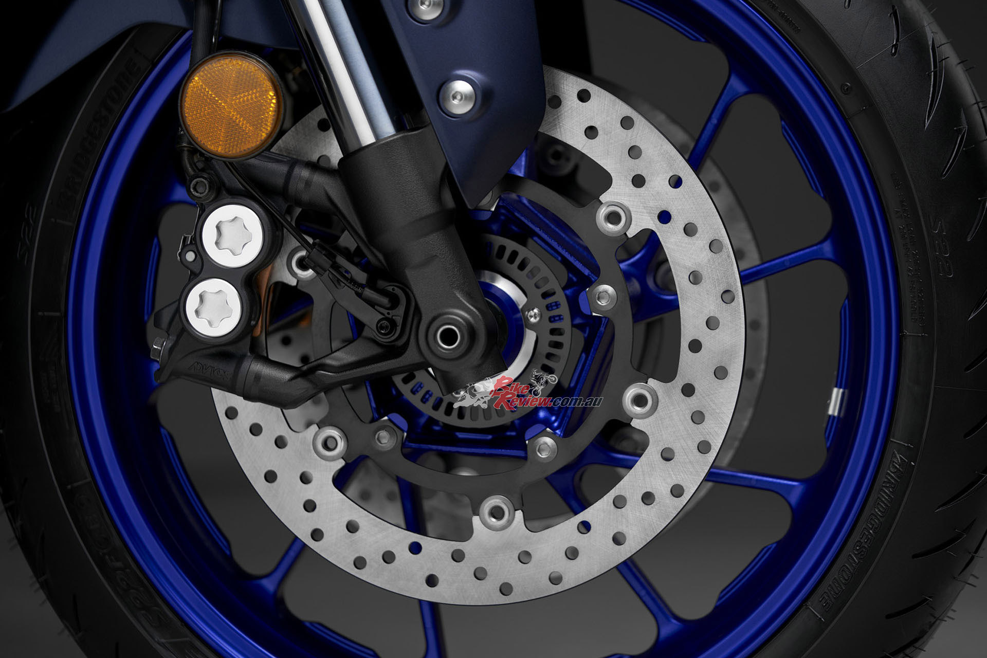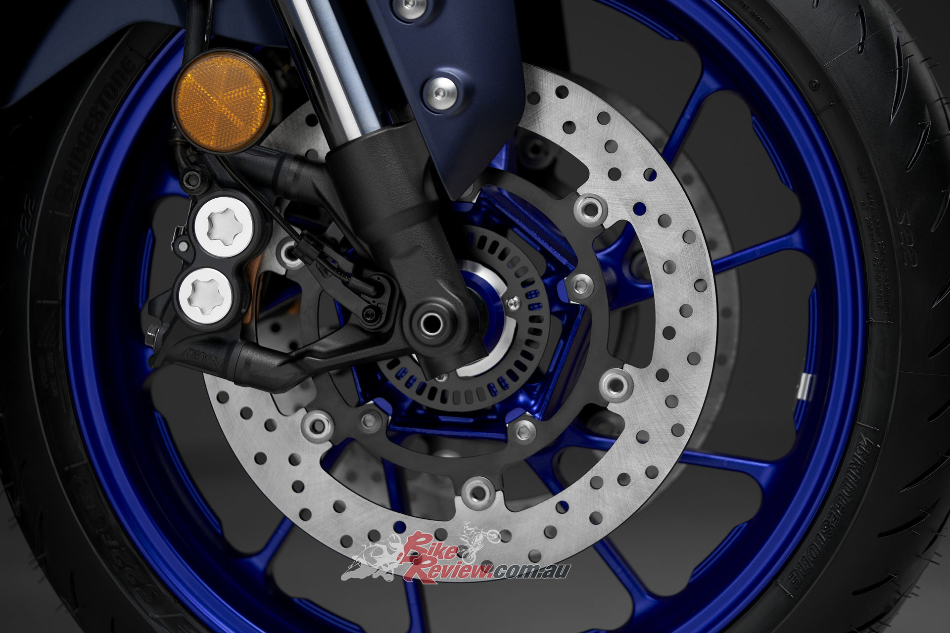 Brakes: 298mm rotors (f), dual four-piston calipers and Brembo radial master-cylinder, 245mm rear rotor, two-piston caliper, ABS.