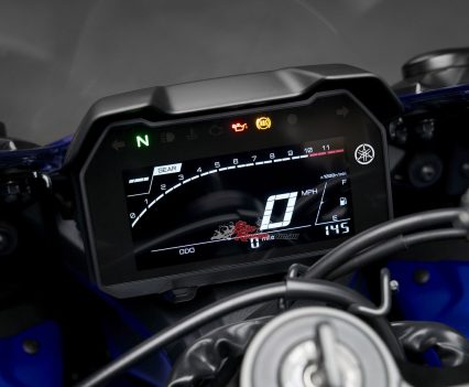 The 2022 YZF-R7 features a new full LCD instrument panel. The high-contrast negative dashboard and its compact and lightweight multifunction display with larger displays for the clock, gear, trip meters and tachometer provide clear information. The use of spot colour gives an accent for the high-rpm range display – and new handlebar switches enables the rider to operate the meter more easily and efficiently.