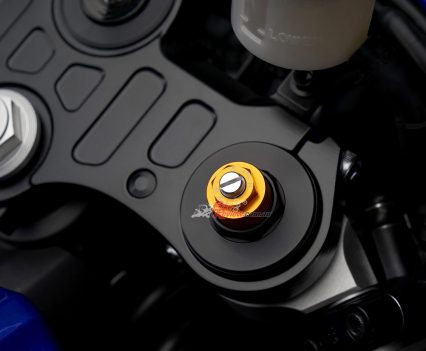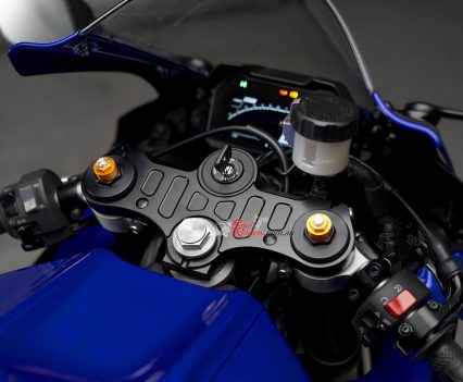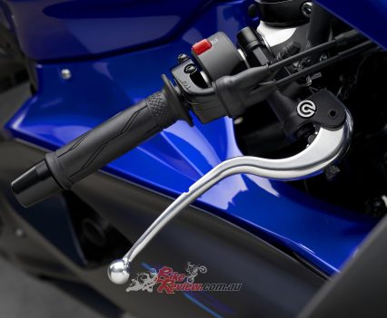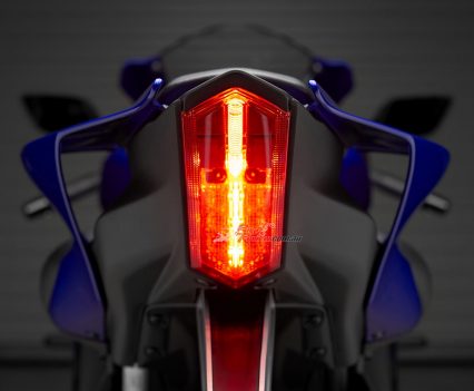 Yamaha say the comfortable new seat with material and cushioning used in the YZF-R1, combined with new low-profile fuel tank covers with deep knee pockets for optimal hip and knee positioning gives the rider freedom to move while also providing a firmly planted feel when leaned over. Separate clip-on handlebars are set in relation to the rider’s hips and footpeg positions for an aggressive position allowing the rider to naturally grip the machine with confidence, especially when tucking behind the windscreen on twisty roads or on the racetrack.
