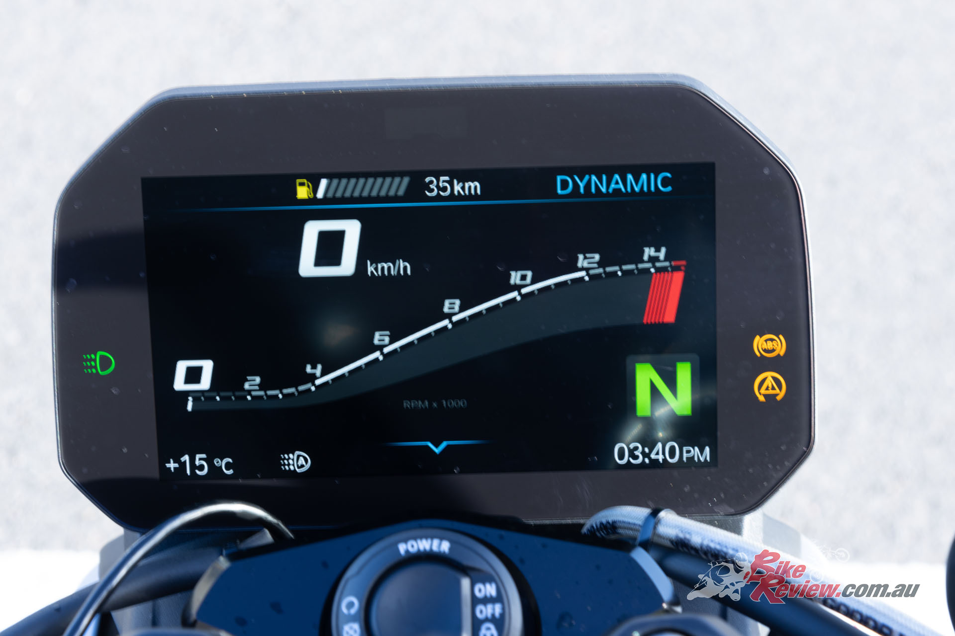 Throwing a leg over, I immediately love the riding position, for my 182cm frame it’s perfect. I’m upright, but have a slight reach to the ‘bars, bringing my body forward slightly so I put more weight on the front and promote extra grip. With the key-fob in my pocket a push the start button and the 6.5in TFT dash springs to life and I’m treated to a bright, easy to read and very uncluttered screen.