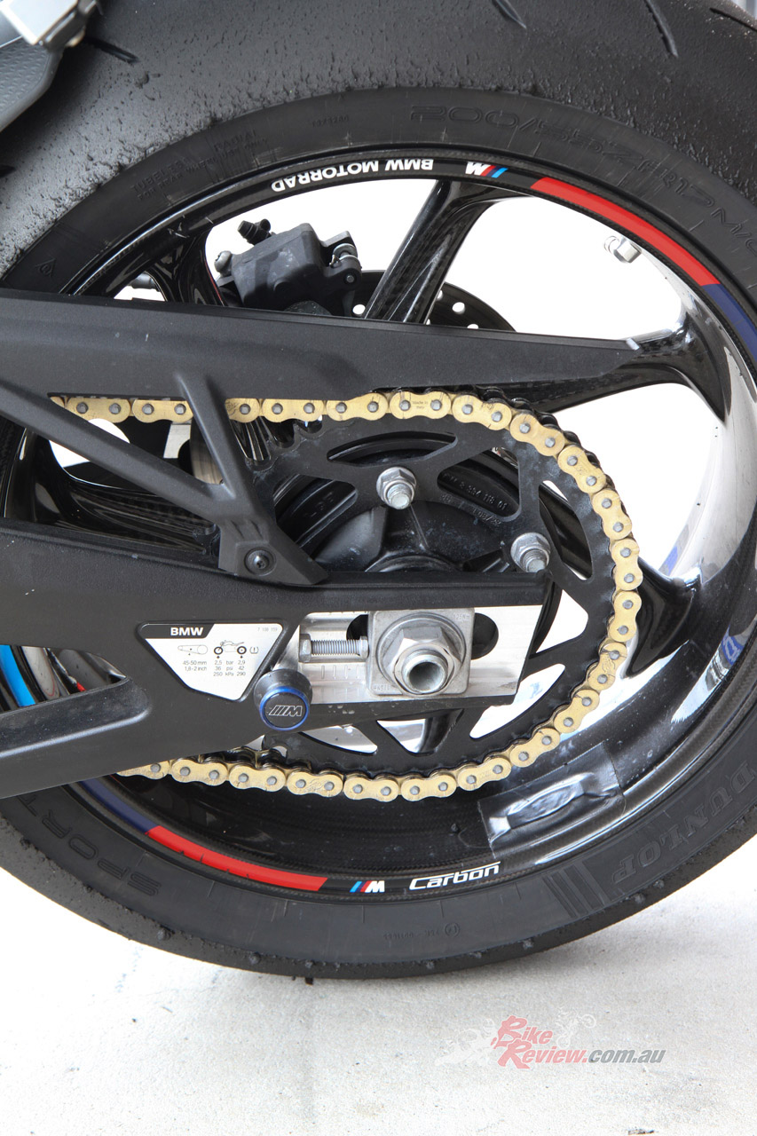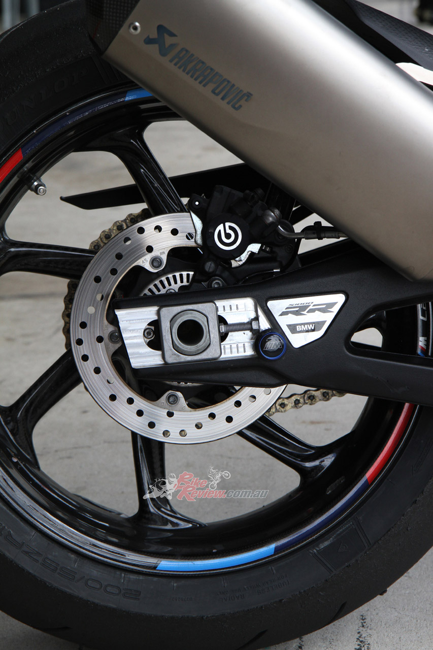 The forks are doing whatever they do, and are giving good support under heavy braking, while tracking through a turn well and there is loads of front feedback for what I recall from an S 1000 RR, which must be the increase in trail combined with the frame flex and longer wheelbase. The bike is so settled, so planted, even through T1 over the apex bumps, at close to 200km/h, it’s rock solid. Very balanced.