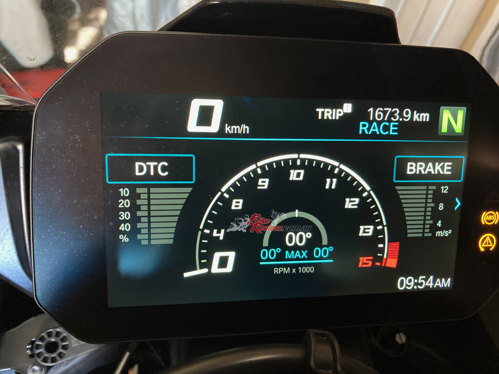 The throttle is smooth, it is really docile in the lower gears, has compliant suspension, and to ride it around town or in the wet, on your commute, you really wouldn’t know you were on a fire breathing track weapon. The ride position is not too extreme even by sportsbike standards, the seat is firm but supportive enough and you can even connect your iPhone to the TFT dash of course…