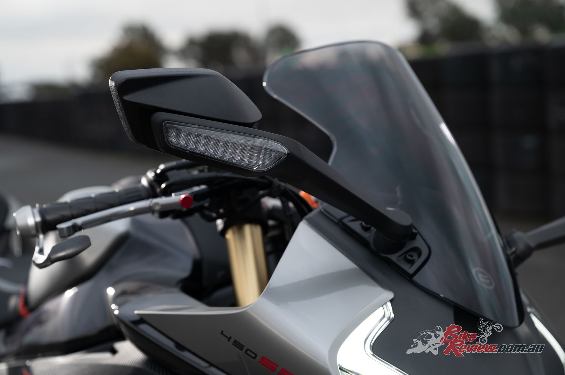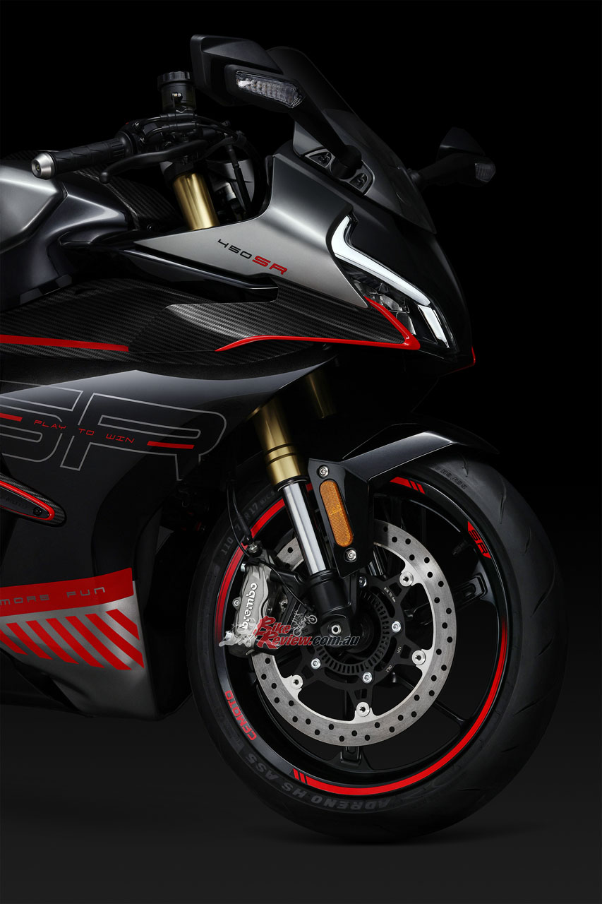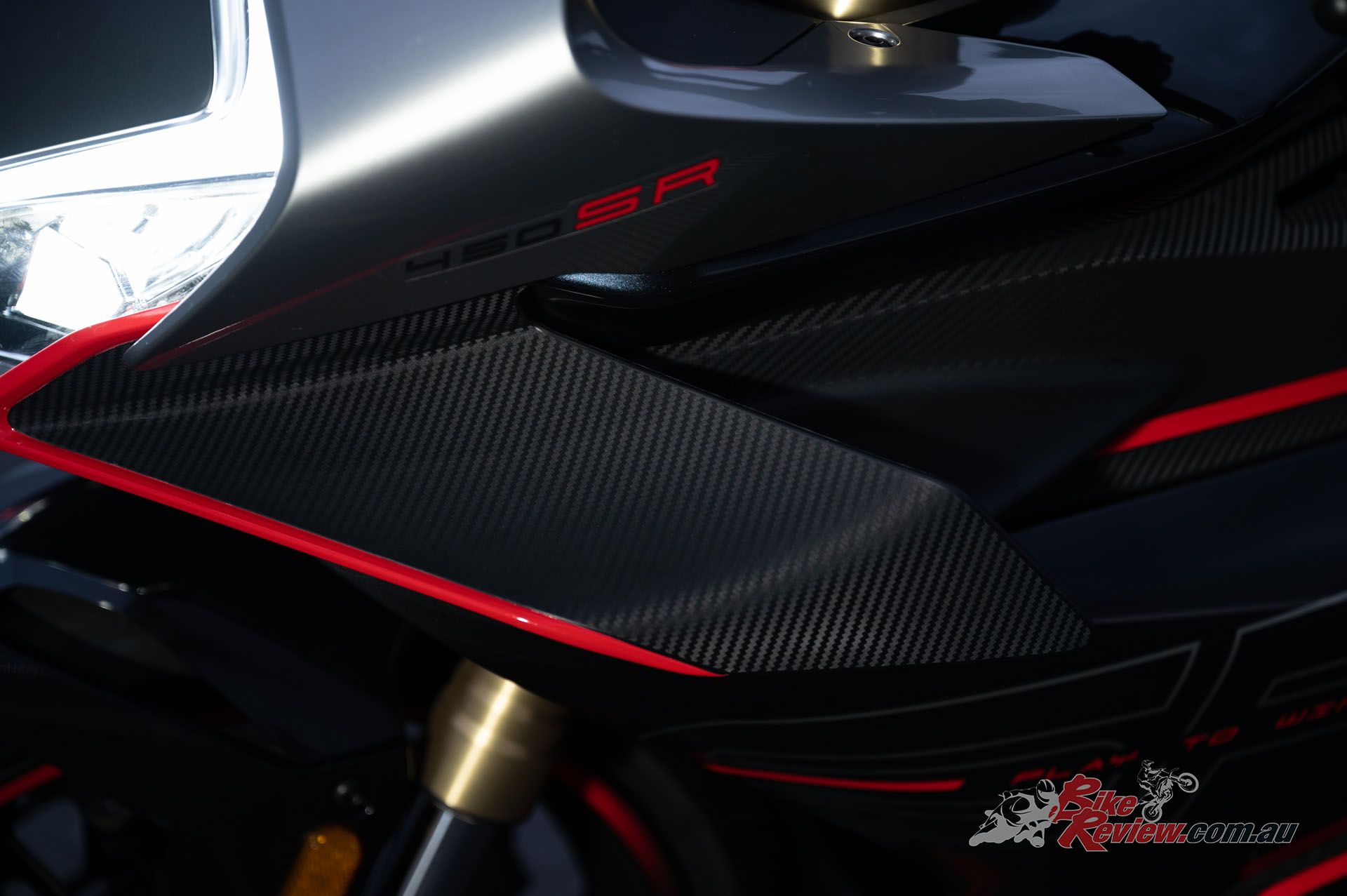 The 450SR’s fairing got put through over 30 hours of extensive aerodynamic wind tunnel testing. The SR line’s split front face line cowling design was sculpted with enlarged grooves to minimise drag-loses. CFMOTO claim those winglets aren’t just for looks too, they offer 1.6x downforce…