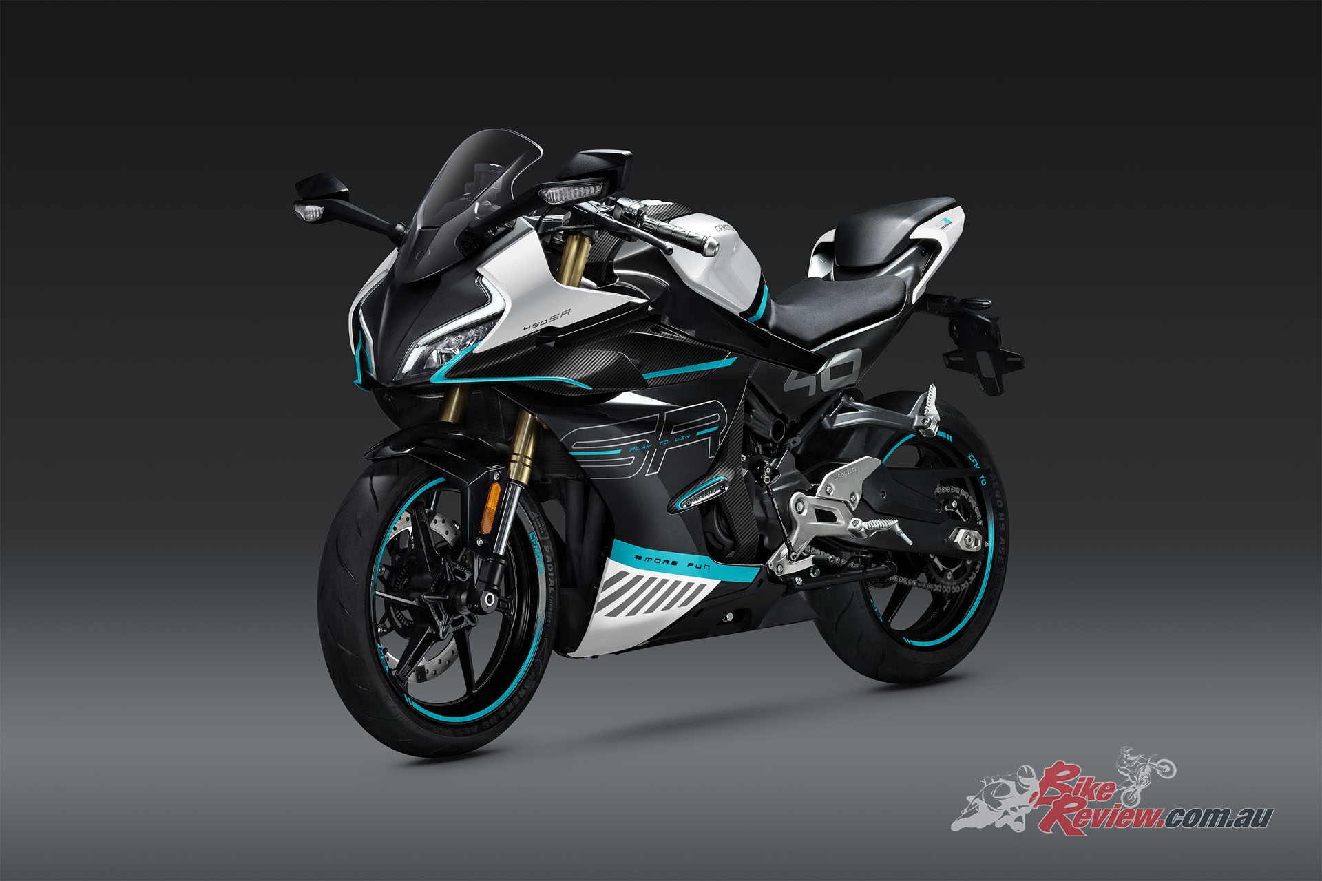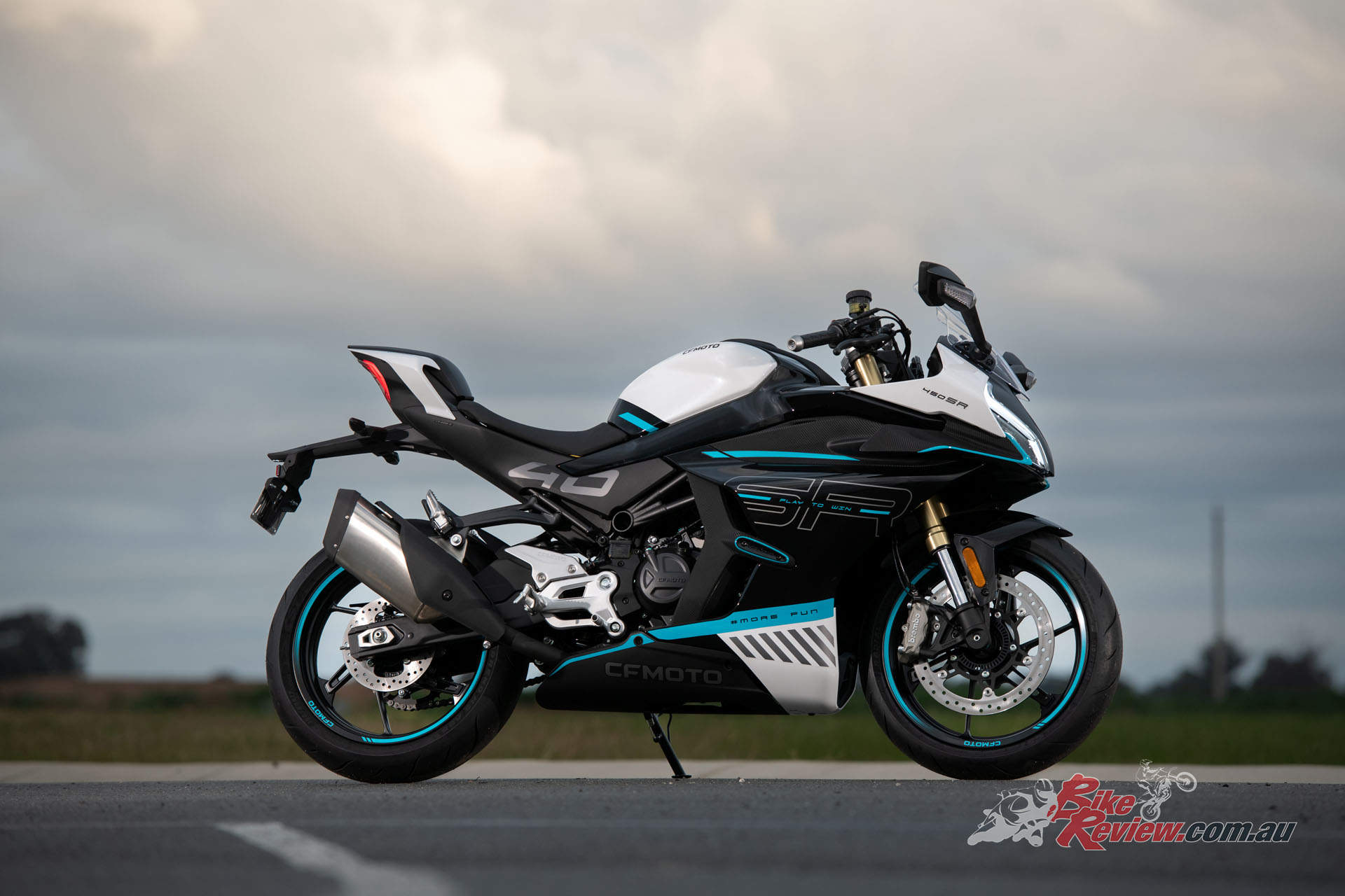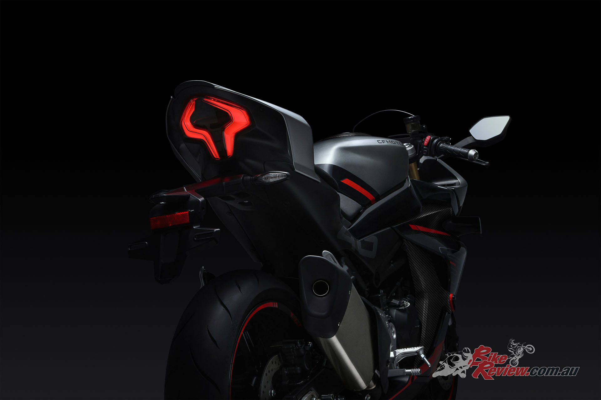 The 450SR’s fairing got put through over 30 hours of extensive aerodynamic wind tunnel testing. The SR line’s split front face line cowling design was sculpted with enlarged grooves to minimise drag-loses. CFMOTO claim those winglets aren’t just for looks too, they offer 1.6x downforce…
