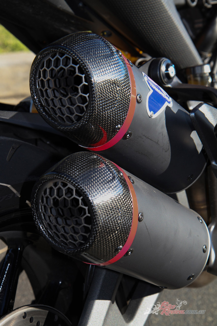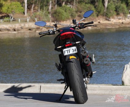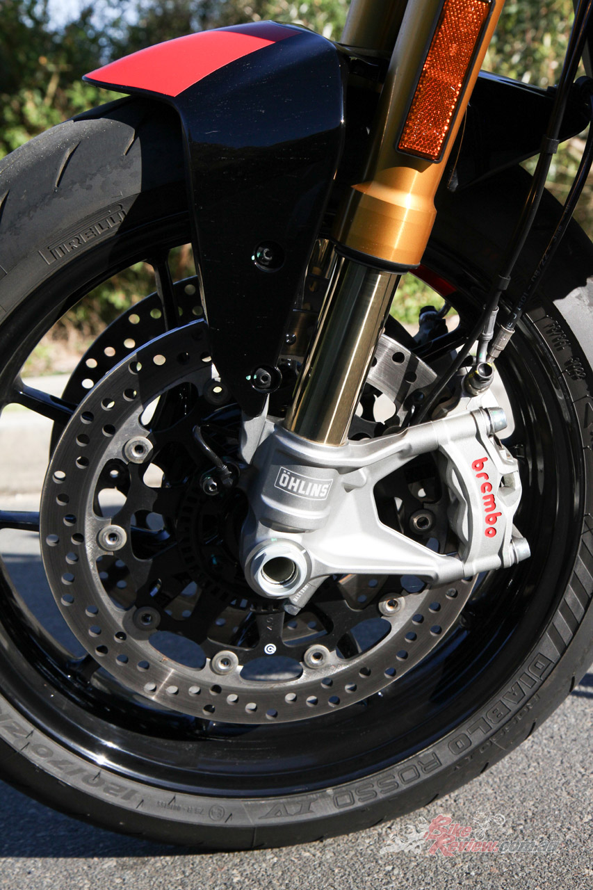 The SP version gets Ohlins forks, Brembo Stylema calipers, Pirelli Diablo Rosso IV tyres, Termignoni muffler, sports seat and graphics, steering damper, and Ohlins shock. It arrived in May for $23,200 Ride Away.