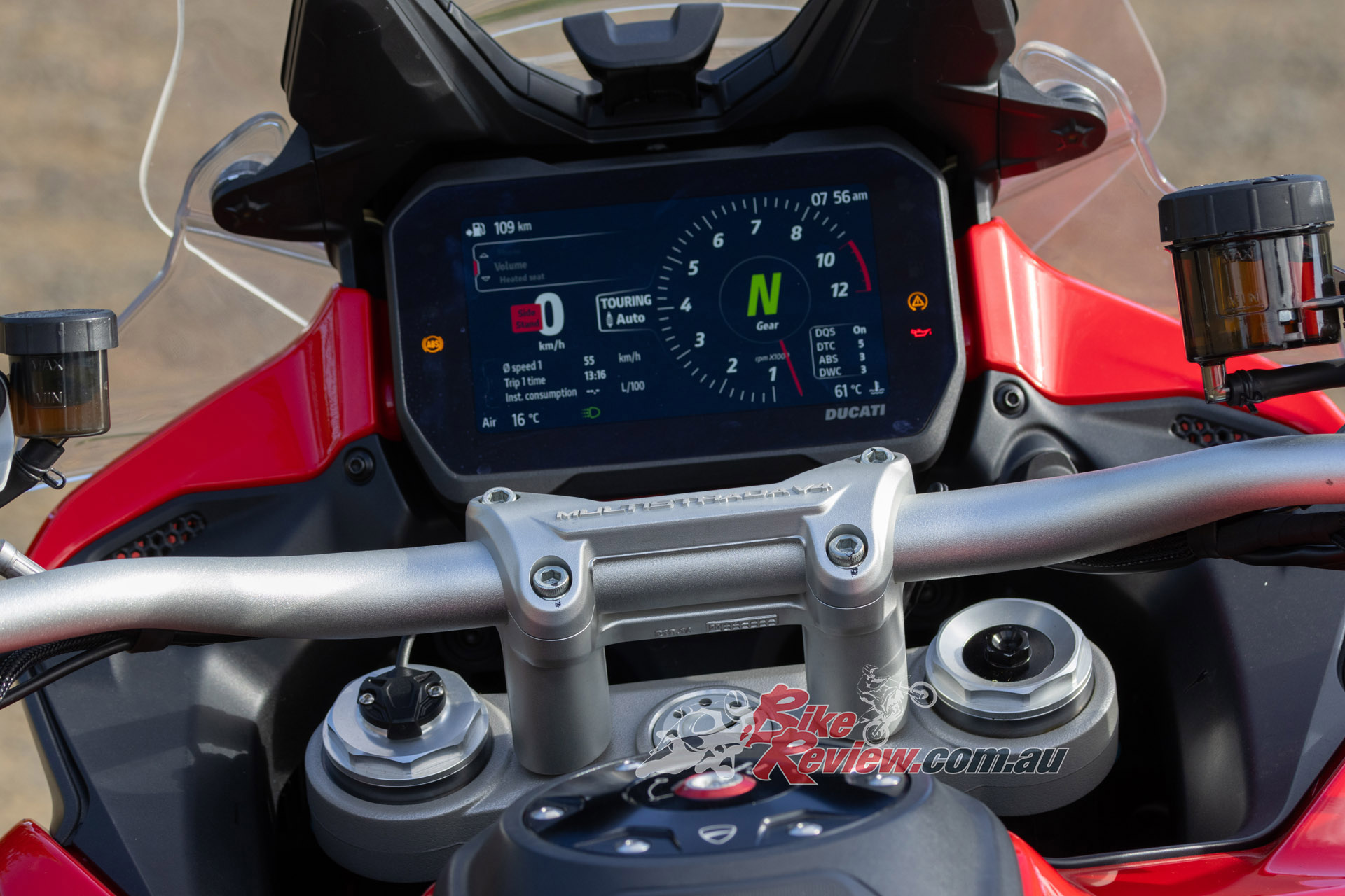 I can feel the weight by lifting the bike off the sidestand and pushing it out through the gate. Ducati claims 217kg dry, which would be more like 240kg wet. Still, it’s easy to push around with the wide ‘bars. My first ride is my 50km commute to work, which is almost all freeway and setting off in the dark. I’d previously set the Touring mode for the softest settings possible to give me the smoothest ride on the way to work and smooth it is.
