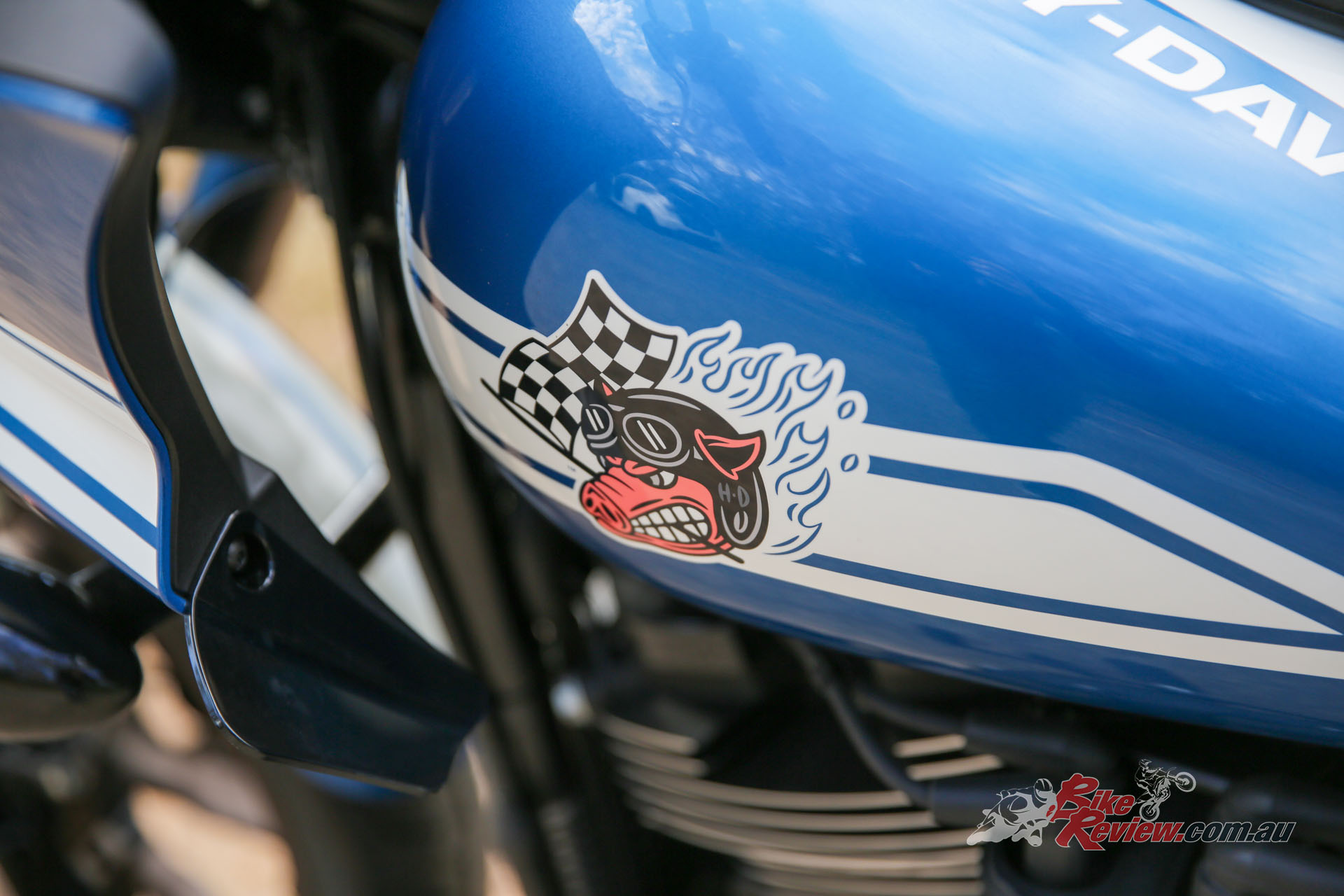 H-D say that the Fast Johnnie paint scheme taps into iconic design themes featured on high-performance muscle cars and (USA) pony cars of the 1960s and 1970s. The Fast Johnnie character applied to the left side of the fuel tank also appears on the Harley-Davidson Screamin’ Eagle factory bikes raced in the MotoAmerica King of the Baggers series.