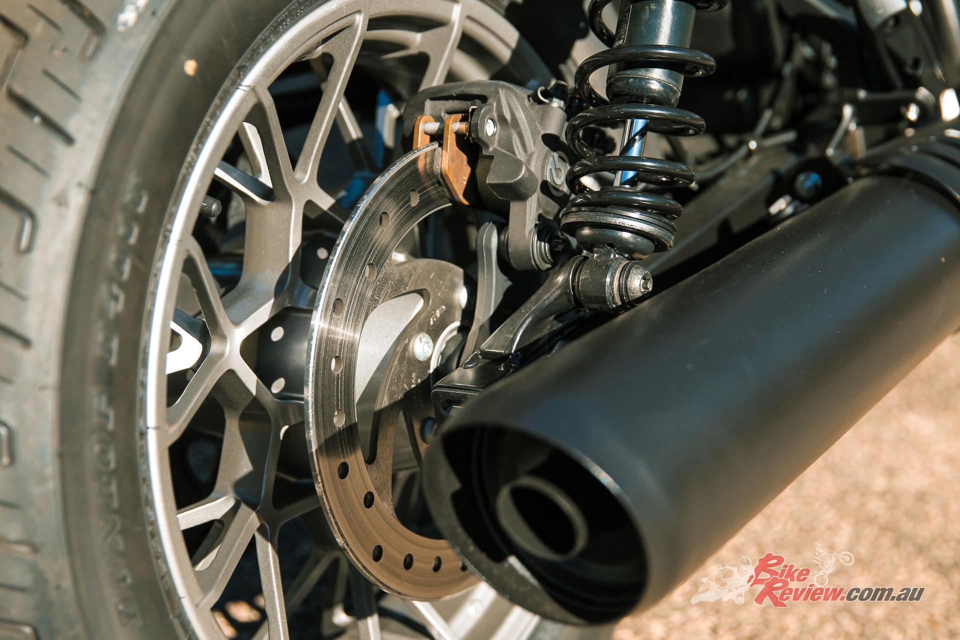 Brakes: Single front rotor with Brembo four-piston caliper, single rear rotor and single-piston caliper, ABS