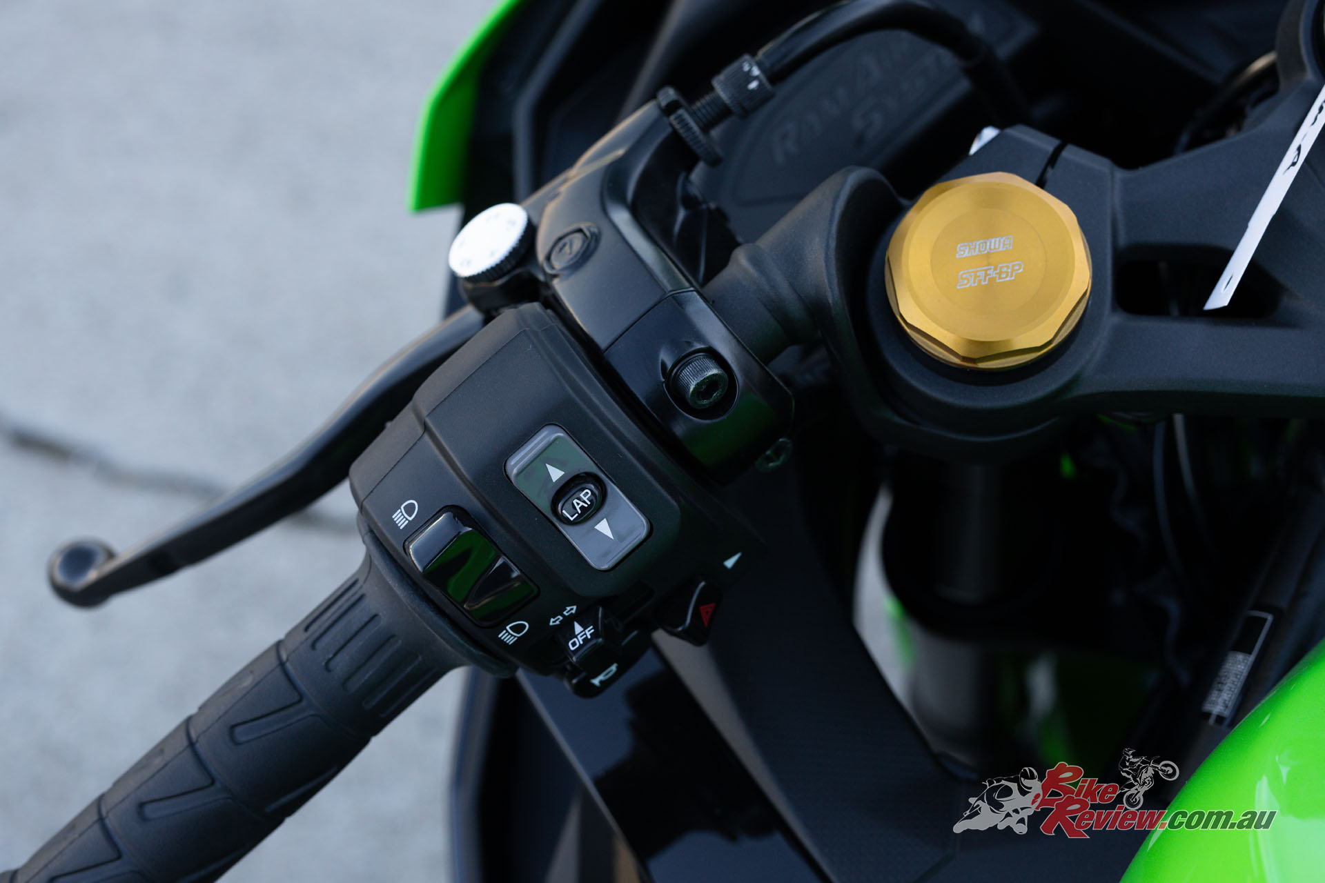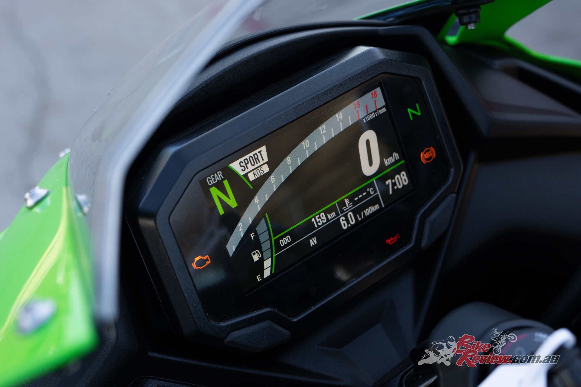 You’re met with a gorgeous 4.3in full-colour TFT dash that can be connected via Bluetooth to your phone for the typical Kawasaki Rideology app. You can access the two power modes (Full and Low), KTRC levels and rider profiles. The TFT can also be switched into a track mode, which includes a lap-timer and only shows you the tacho above 10,000rpm.