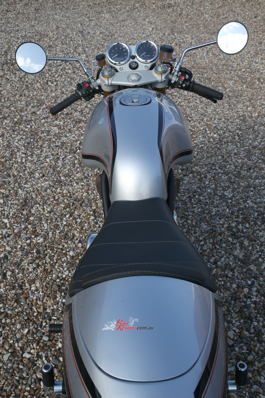 The two different versions on the same retro theme felt very different to ride one than another, though, and that’s obviously due to the contrasting riding positions. The CR’s low-set clipons impose a stretched-out stance as you reach forward across the fuel tank to adopt a chindown riding position that’s ultimately quite tiring – but also feels bloody good fun! It imposes a greater sense of community with the motorcycle, so that you find yourself riding it more intuitively and with a greater sense of purpose, resulting in increased turn speeds and an enhanced sense of enjoyment. It’s also easier to go faster on it if you wish – but sometimes inadvertently so!