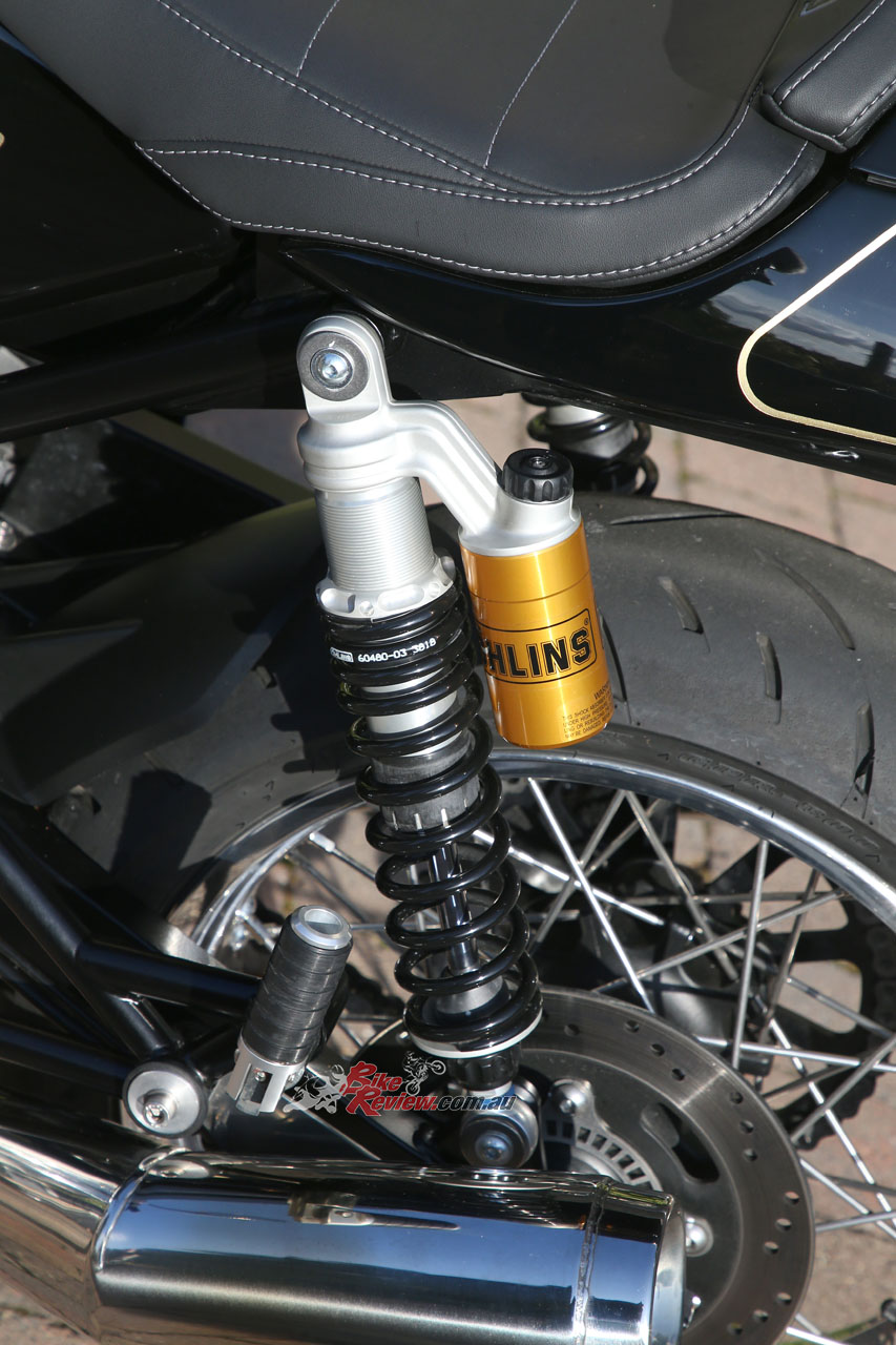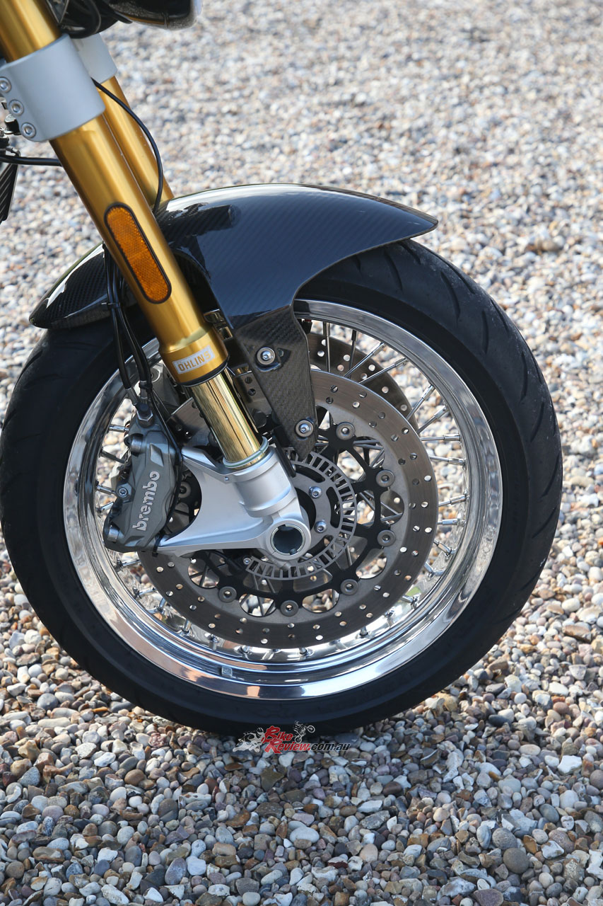 The twin Öhlins piggyback rear shocks are likewise fully adjustable, while the Brembo brake package sees fully-floating 320mm steel discs gripped by four-piston Monoblock radial calipers, with a 240mm rear disc and two-piston caliper, and twin-channel Bosch ABS, albeit not the lean sensitive type.