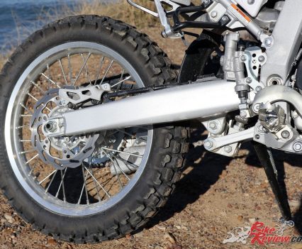 Brakes are single rotors front and rear with a 250mm front with dual-piston caliper, and 230mm rear with single-piston caliper. Wheels are a 21in front which takes a 80/100-21 and 120/80-18in rear and are of course spoked, taking tubes.