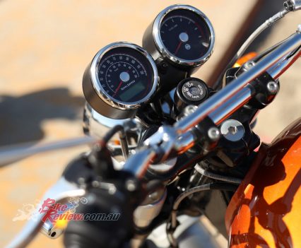 The bike feels light on the move and has great chassis balance. Ground clearance is not an issue, I only touch the ‘pegs down a few times all day, and the basic old school clocks and dash are simple to read. A clock would be nice though.