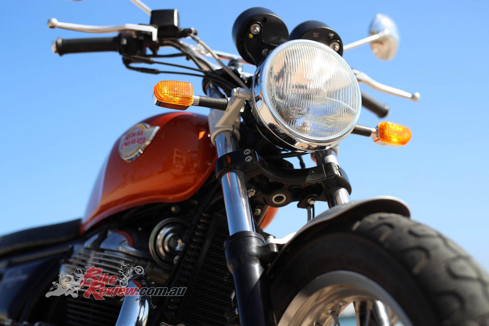 Royal Enfield wanted to go with clean lines that would reflect the heritage of the twin and they did not want a radiator. The engine is a four-valve per-cylinder SOHC with screw and locknut valve adjustment via finger followers. It is compact in width and is quite short, with a six-speed gearbox developed on road and racetrack and a slipper clutch that is cable actuated.