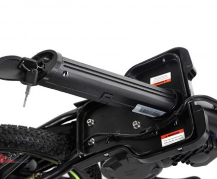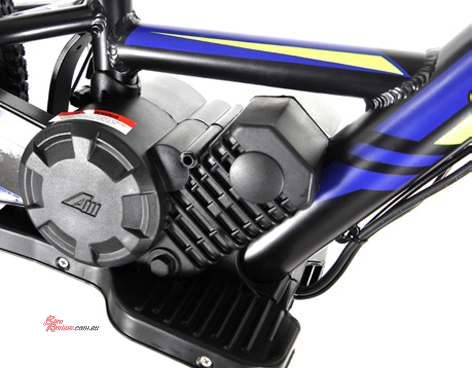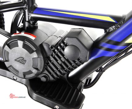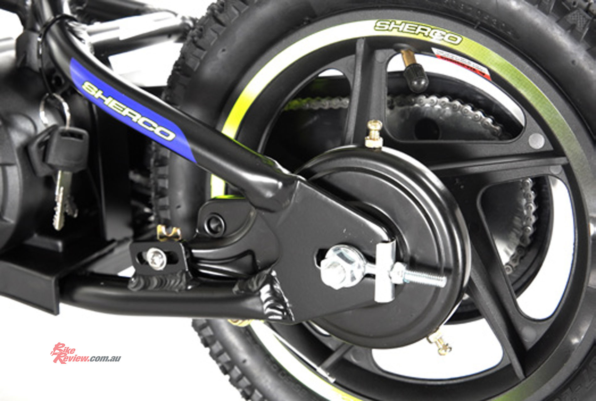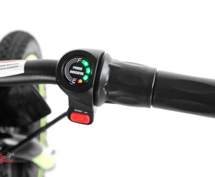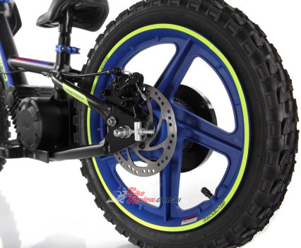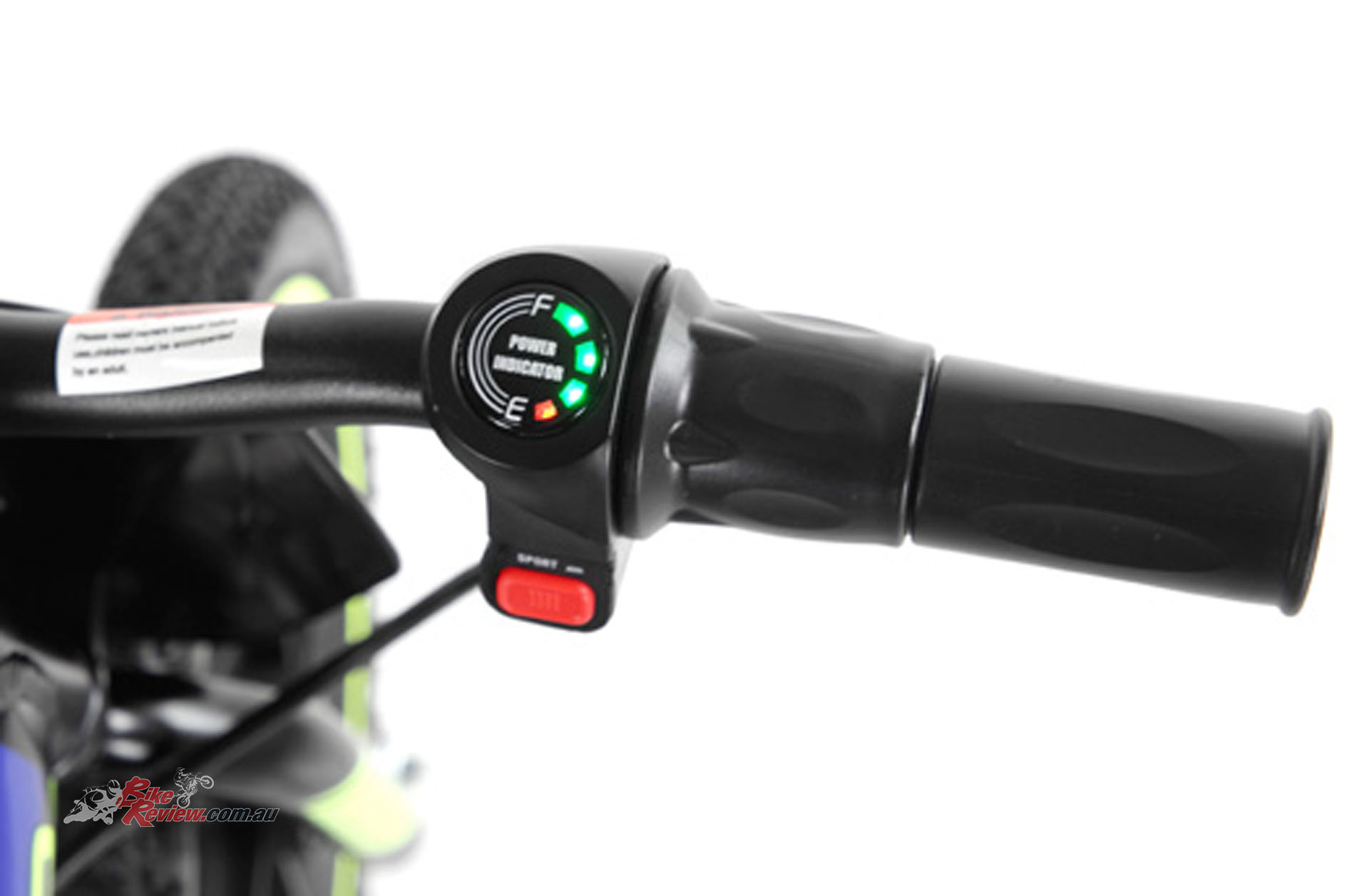There is a fully enclosed chain cover, and a power cut-off switch built into the brake lever which automatically cuts power if the rider pulls in the lever – preventing a panic throttle twist.