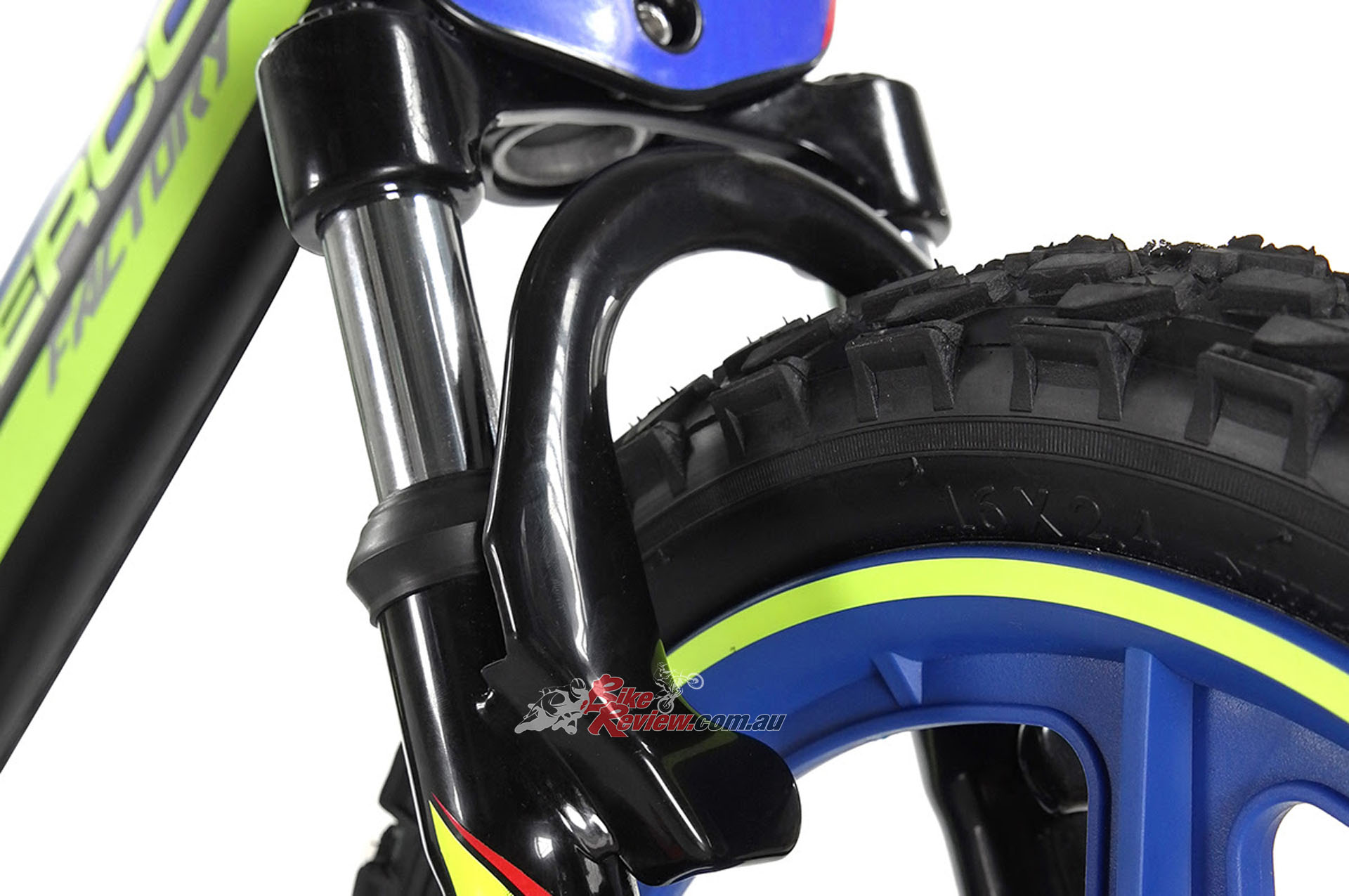 CHASSIS Powder coated alloy frame, alloy steering stem and head, alloy seat pole, handlebars and clamp, steel forks, Nylon 16in wheels, off-road tube tyres, chain drive, drum rear brake, 790mm wheelbase, 62cm max height, 420.5 – 520mm seat height, 11kg weight, 40kg payload
