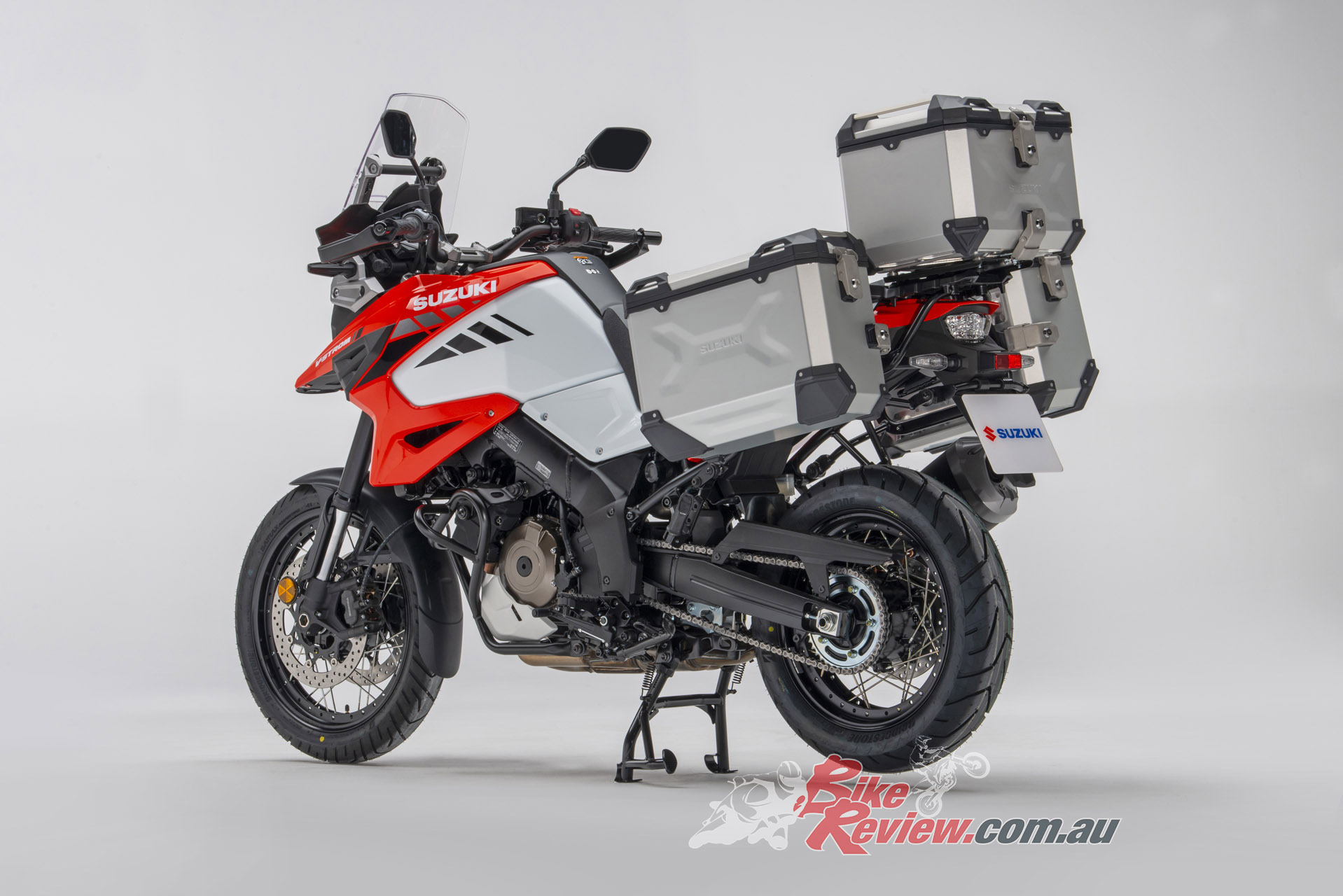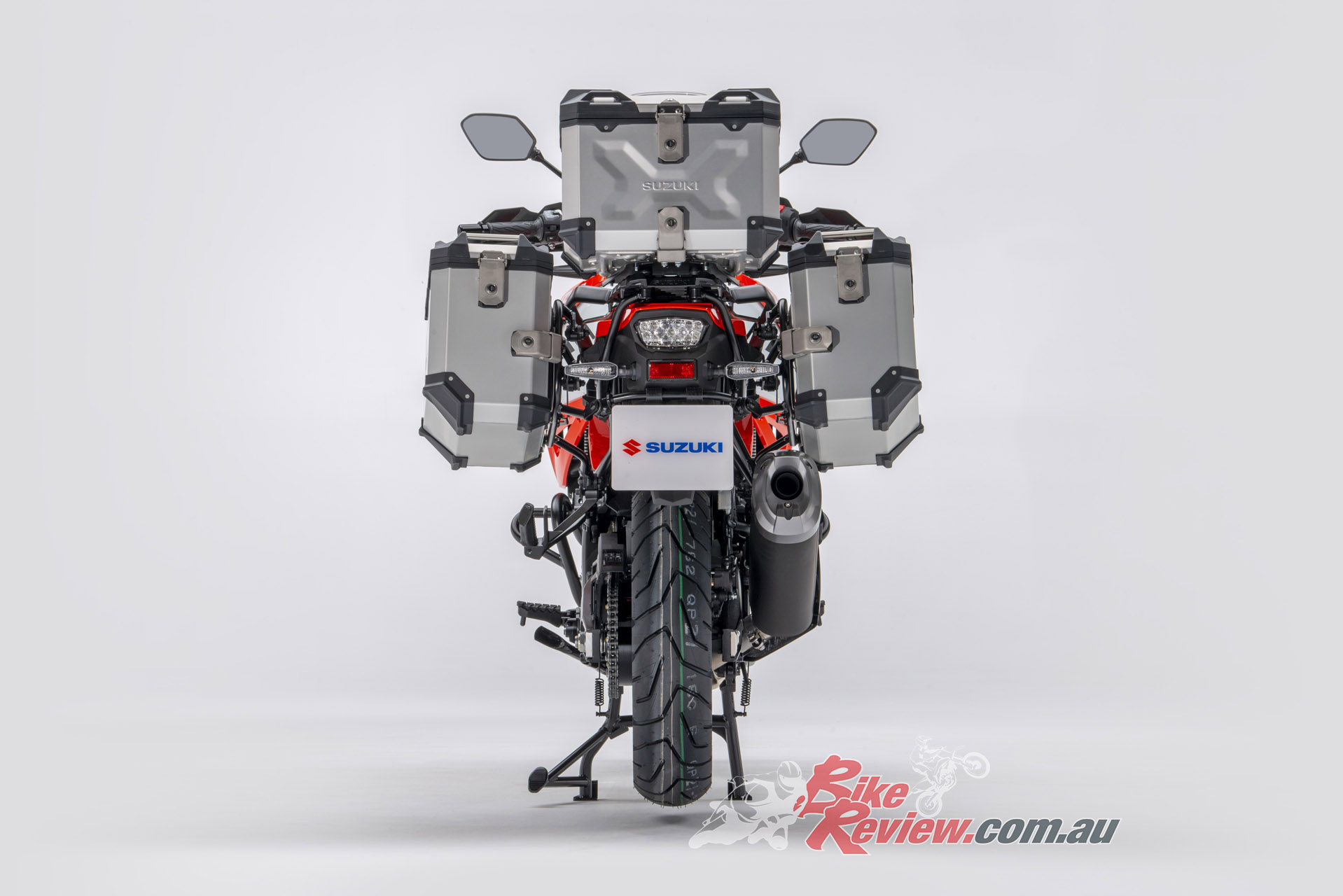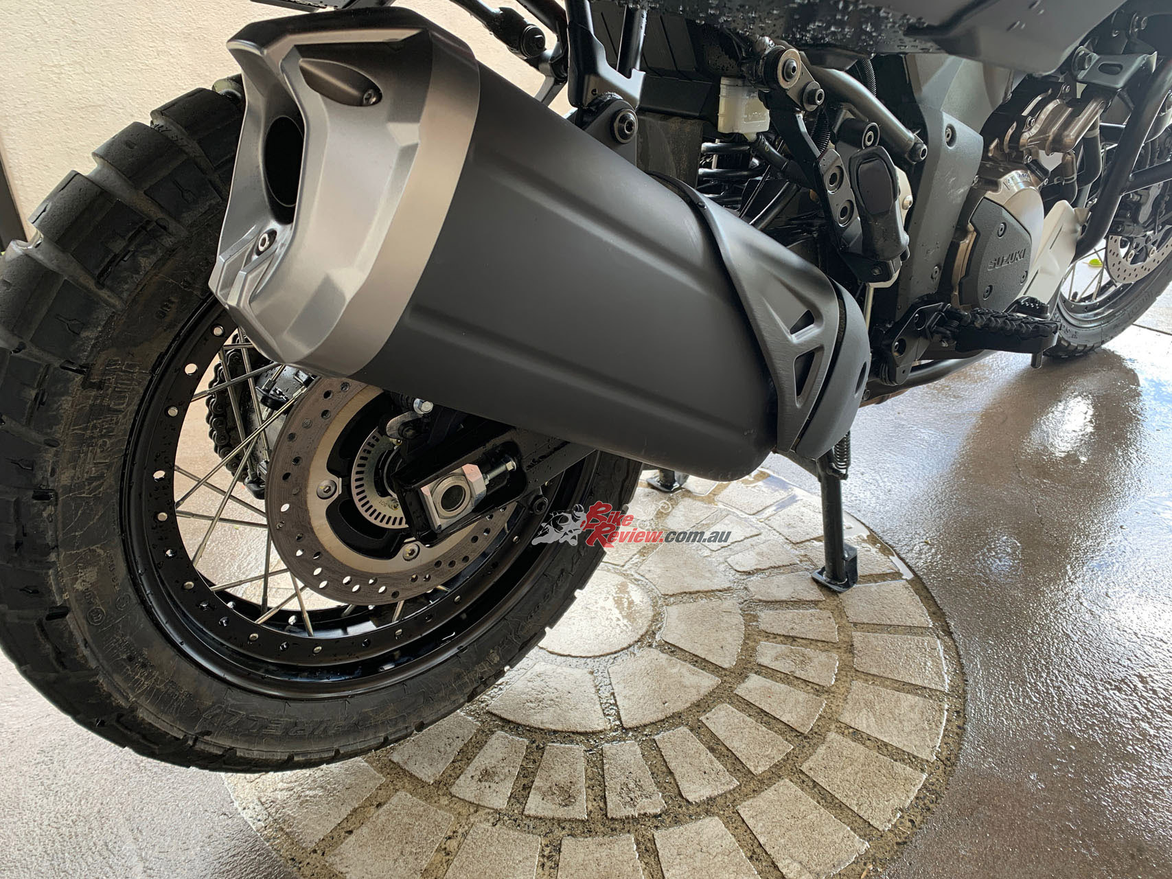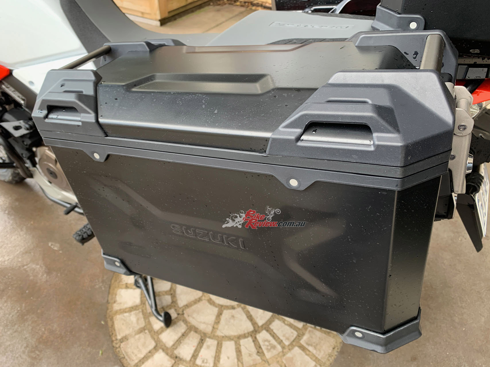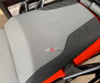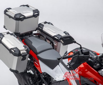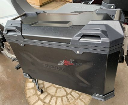 The V-Strom 1050XT we tested was the Aussie Voyager Pack edition, which has this alloy luggage system. It also had Pirelli off road tyres fitted and a crash bars. We had to test during COVID-19 restrictions, so sorry no action shots…