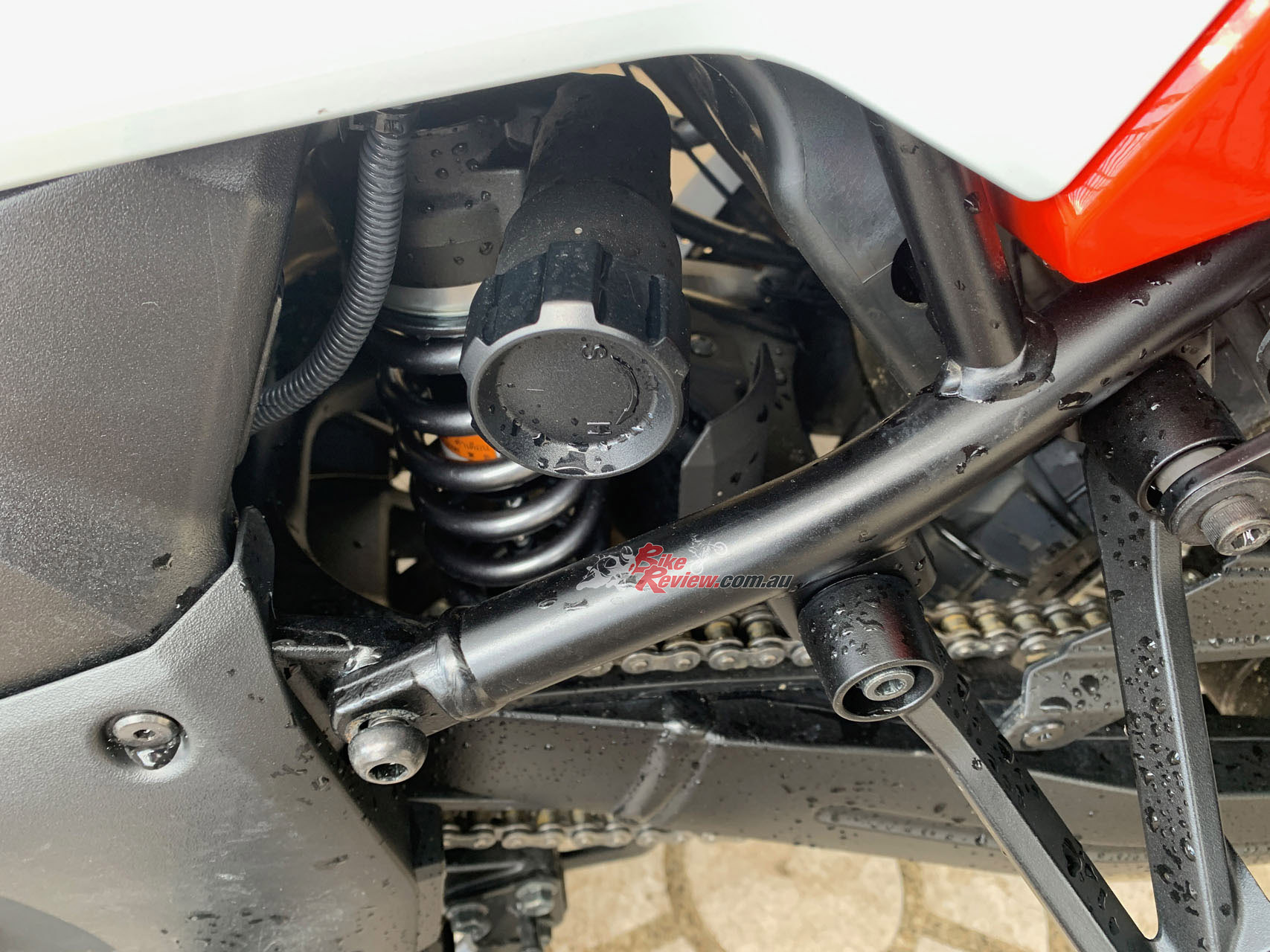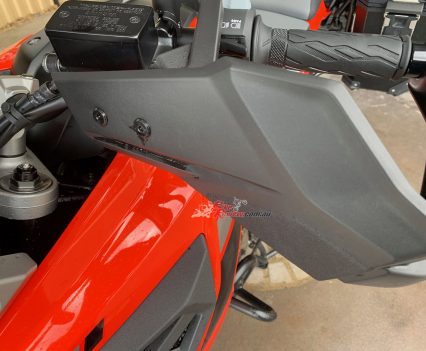 The suspension is fantastic. It is really quite plush and soft but on those typical fast bumpy country Aussie roads it is really nice. It just soaks up all the bumps and with 160mm of travel at each end you can hit big bumps and washouts or corrugations hard and fast with no dramas at all. Up front we have 43mm fully adjustable KYB forks, out the back a KYB shock with preload and rebound adjustment. The remote preload adjuster is handy…