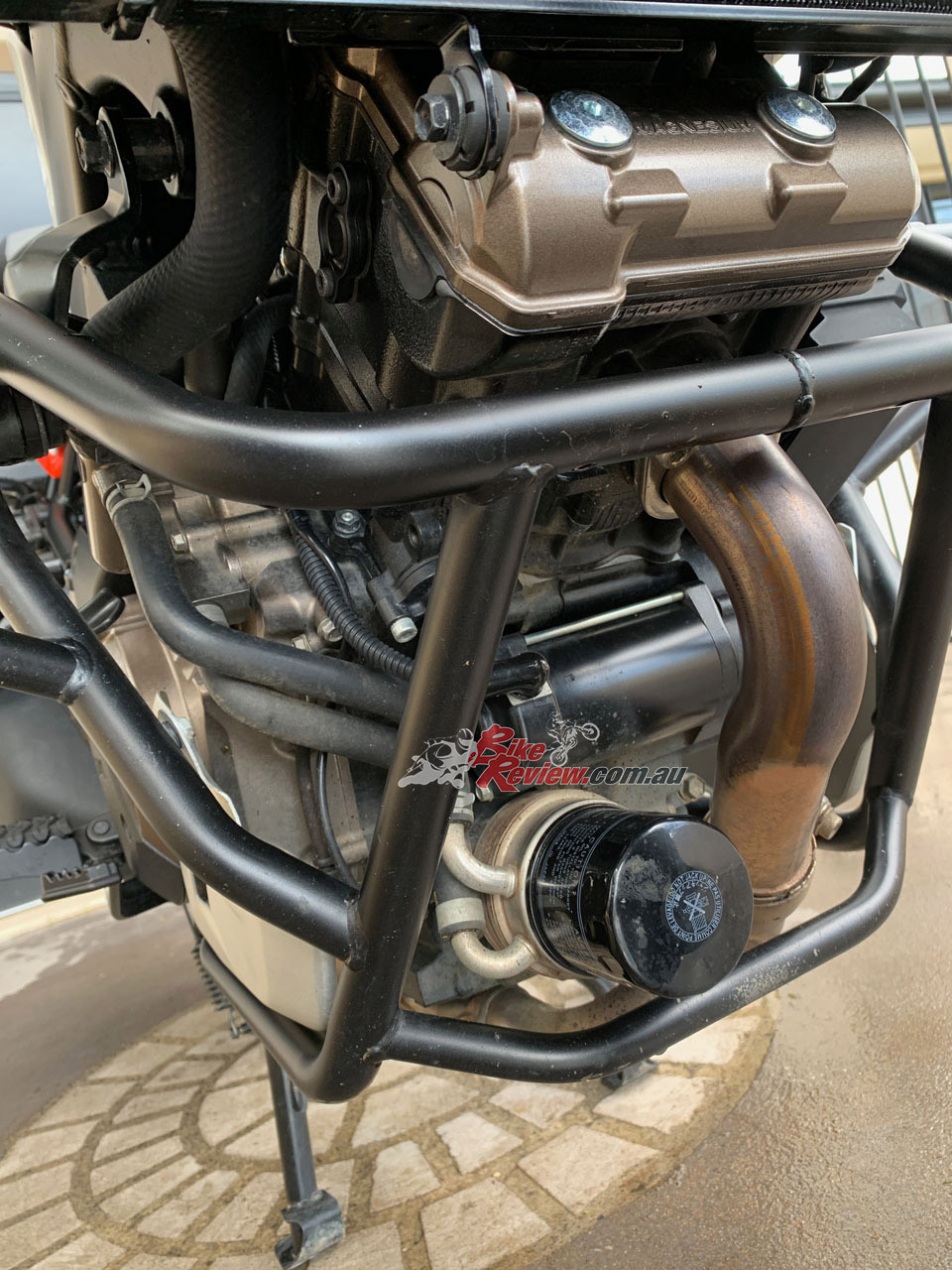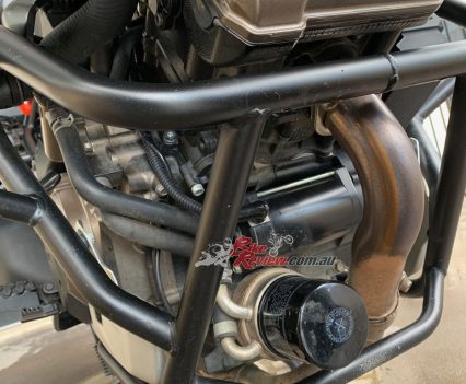 The proven V-Twin engine is now more revvy and peaky, so better on the road and not quite as good off road in our opinion, however, it is silky smooth and characterful. The crash bars are part of the Voyager Pack.