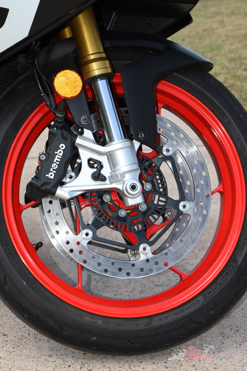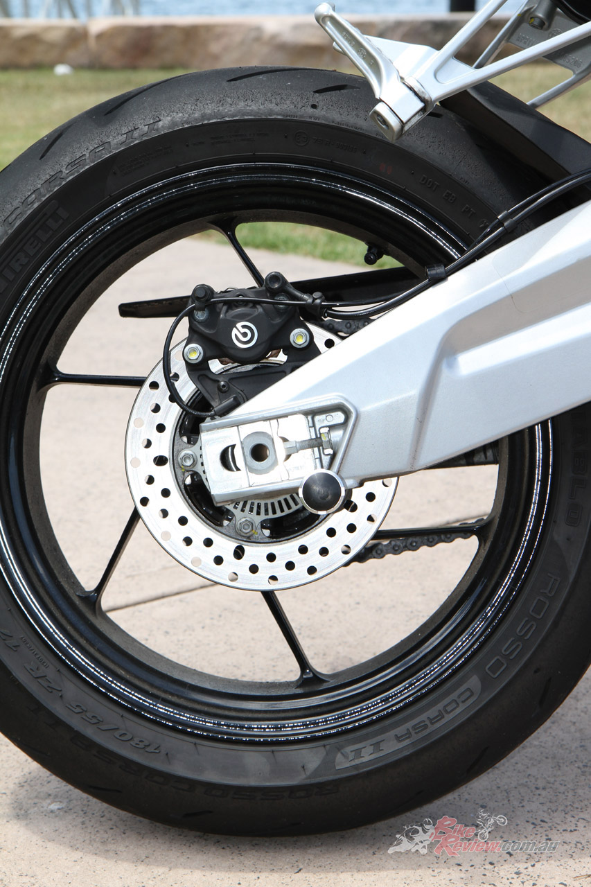 Wheels & Tyres: Cast alloy six-spoke, 17 x 3.50in (f), 17 x 5.50in (r), 120/70 – 17, 180/55 – 17 Pirelli Diablo Rosso Corsa II tyres.