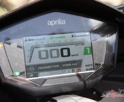 Fit, finish and build are typically amazing from Aprilia. The switches look old fashioned and big but they do the job, the dash too, as modern as it is has that oversized Aprilia look they have had since the 1990s, but hey, the unique and satisfying riding experience more than makes up for those things. Every other part is cutting-edge, from the lights to the high-quality fasteners. I like the neat exhaust and it sounds fine to me, although if I had the spare cash, I’d go for a slip-on…