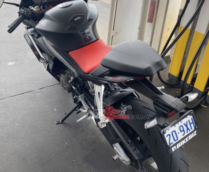 Great ergonomics for a mid-sized sportsbike, particularly for taller riders. Jeff is 187cm and felt comfortable on the RS.