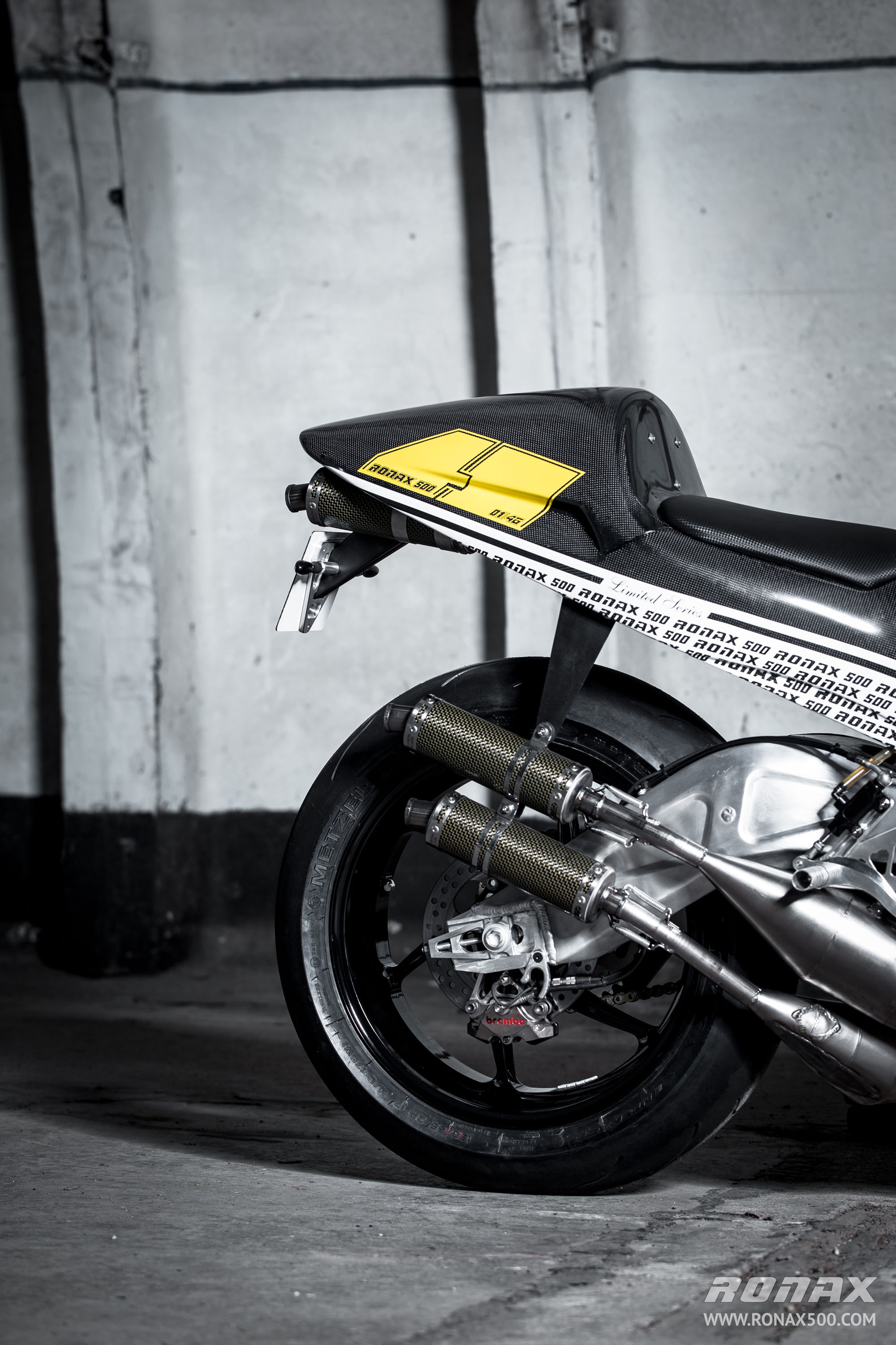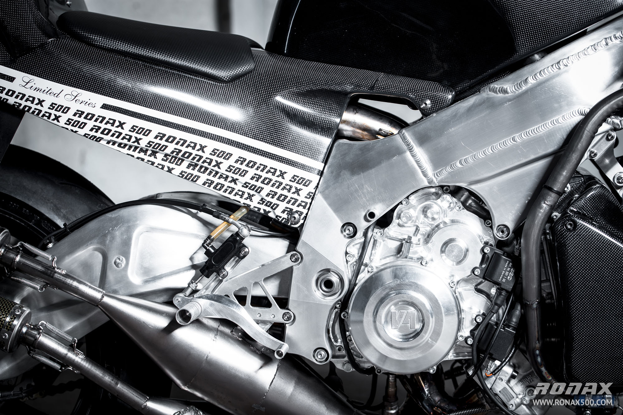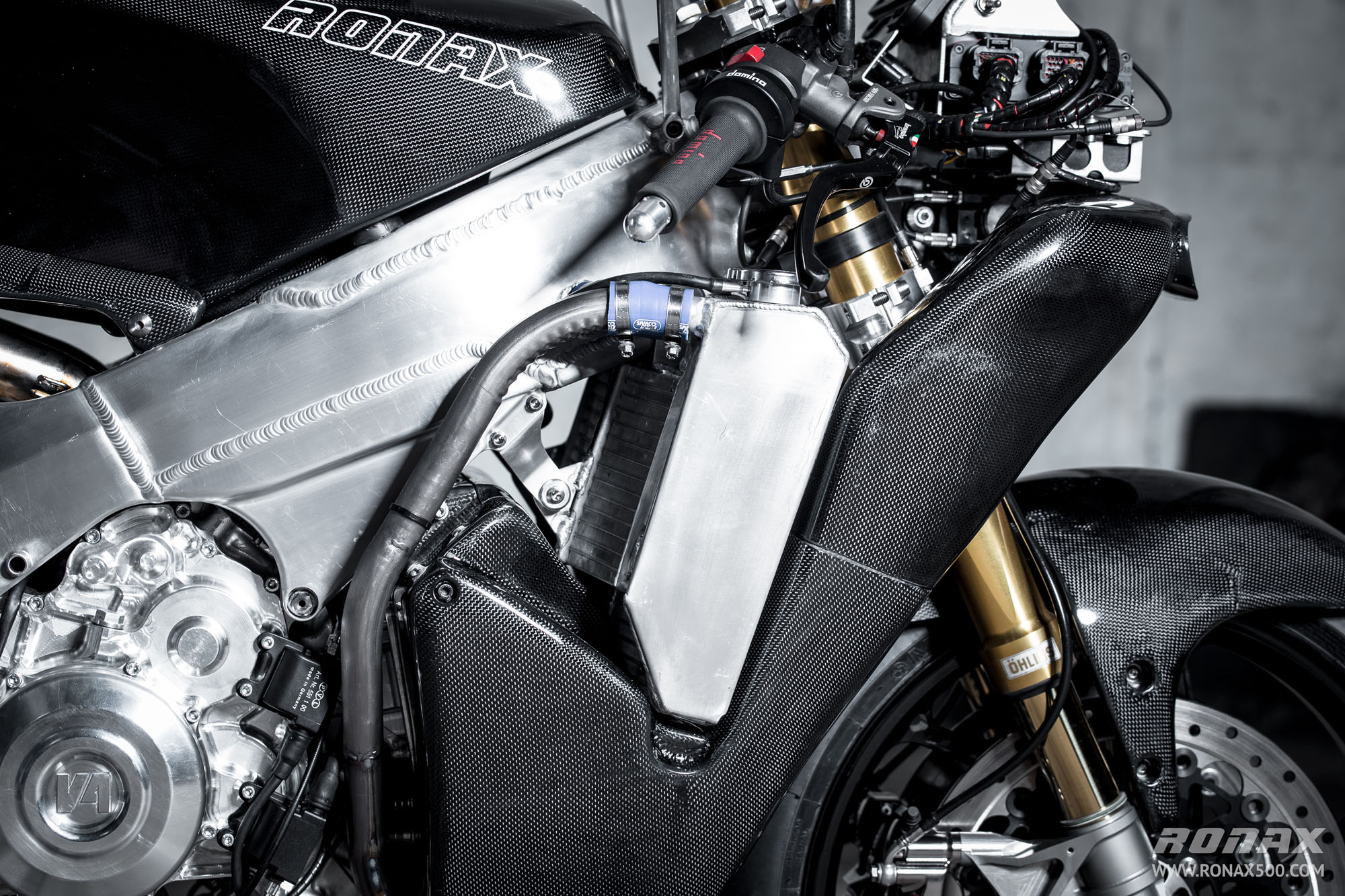 Ronax are claiming 160-rear-wheel-horsepower at 11,500rpm for the bike, which is incredible! Amazingly, the bike even has electric start… The exhaust system is steel according to the specifications rather than titanium, however the mufflers are carbon-fibre. There are two riding maps – Rain and Sport.