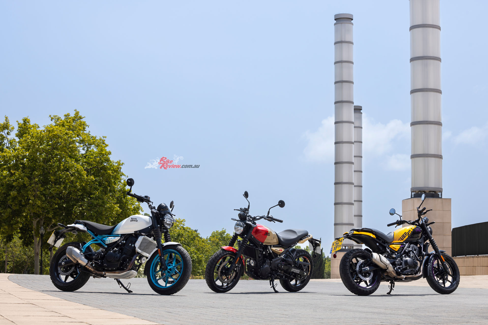 Royal Enfield Guerrilla 450 colours L to R: Yellow Ribbon, Brava Blue, Playa Black, Smoke, Gold Dip.